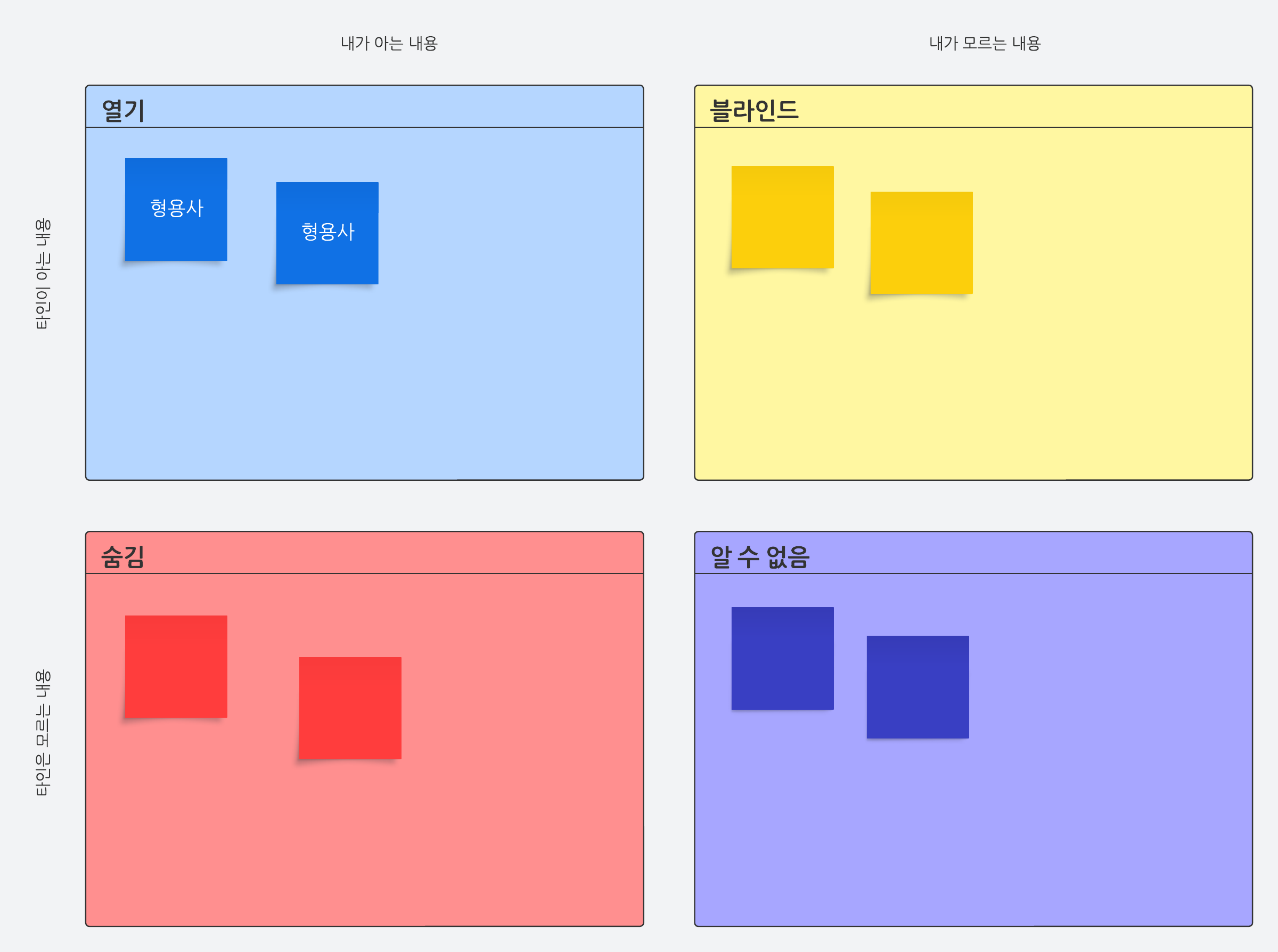 Johari 창은 개인 및 대인 관계를 향상시키는 데 도움이 됩니다. 행동과 성격 특성을 탐구하고 자기 인식과 팀워크를 향상시키기 위해 개방, 블라인드, 숨김, 알 수 없음으로 할당하세요.