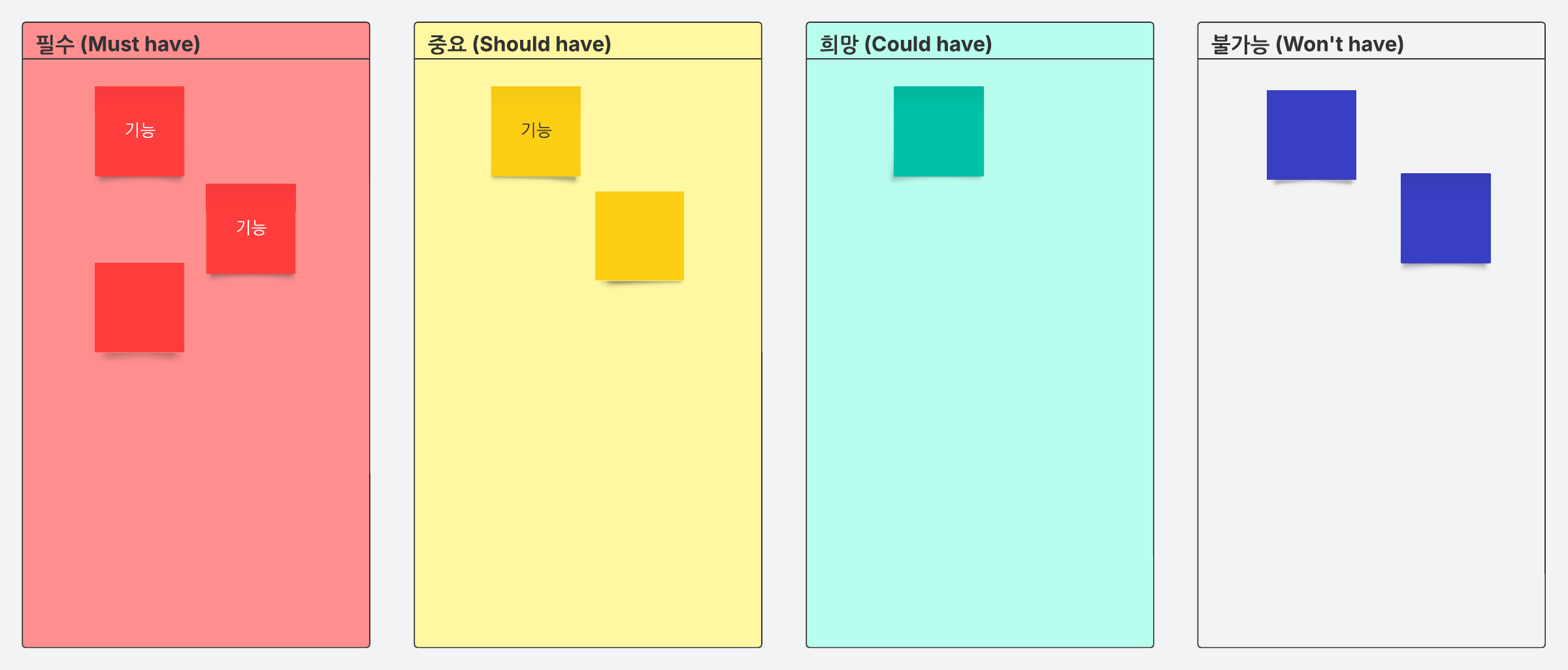 MoSCoW 방법을 사용하여 이니셔티브와 기능의 우선순위를 전략적으로 지정해보세요. 이니셔티브를 필수 (Must have), 중요 (Should have), 희망 (Could have), 불가능 (Won't have) 의 4가지 범주로 분류하세요. 가장 가치가 높은 기능을 파악하고 구현의 우선순위를 정할 수 있습니다.