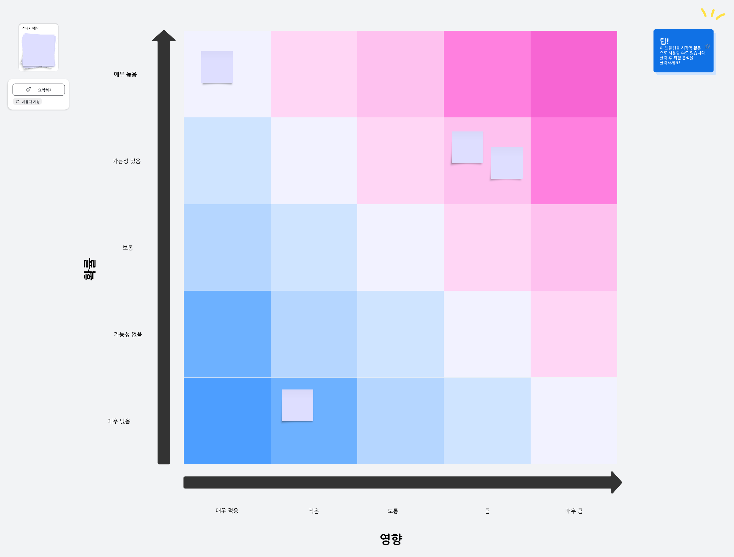위험 평가 매트릭스를 사용하여 위험과 기회를 평가하세요. 시각적 도구를 활용하여 최악의 시나리오를 파악하고 가능한 최선의 선택을 하세요.