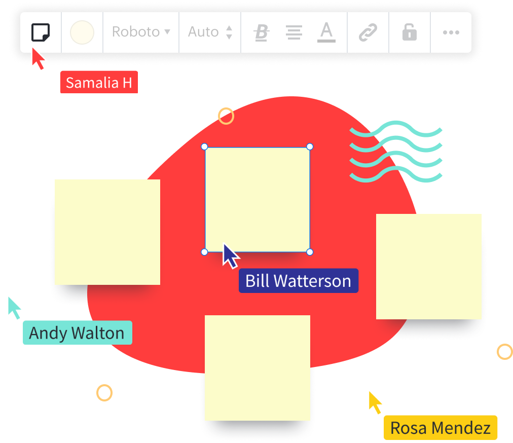 Communicate effectively without ever leaving your Lucidspark board. Hold conversations with our chat feature, and @mention collaborators to solicit feedback, resolve questions, or call attention to specific ideas. Collaborate in real time and easily identify who's contributing what with color-coded cursors, shapes, and lines. Work closely with specific collaborators by selecting to follow them around the board.
