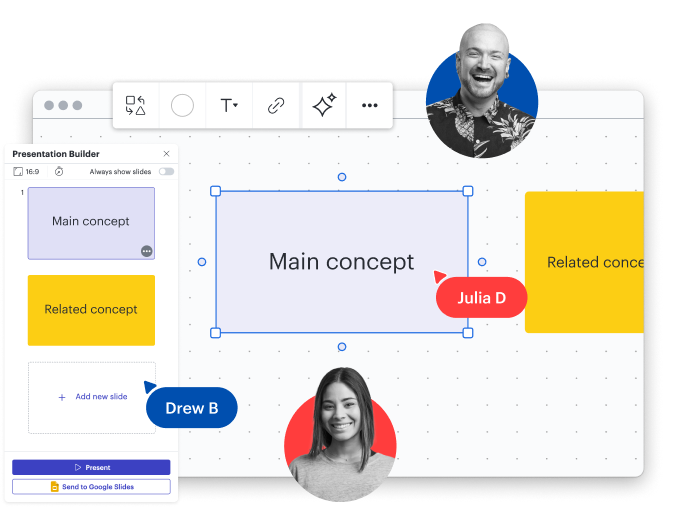 After you’ve created a concept map, it’s time to turn your ideas into action. Vote on your favorite ideas as a team, group common themes, and discuss them in Breakout Boards. You can even turn your Lucidspark board into a presentation to share with others.