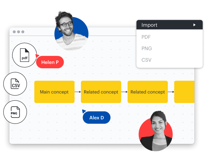 Import your boards from Miro and other online concept mapping software into Lucidspark and pick up where you left off. You can also import PDFs, PNGs, and CSVs.
