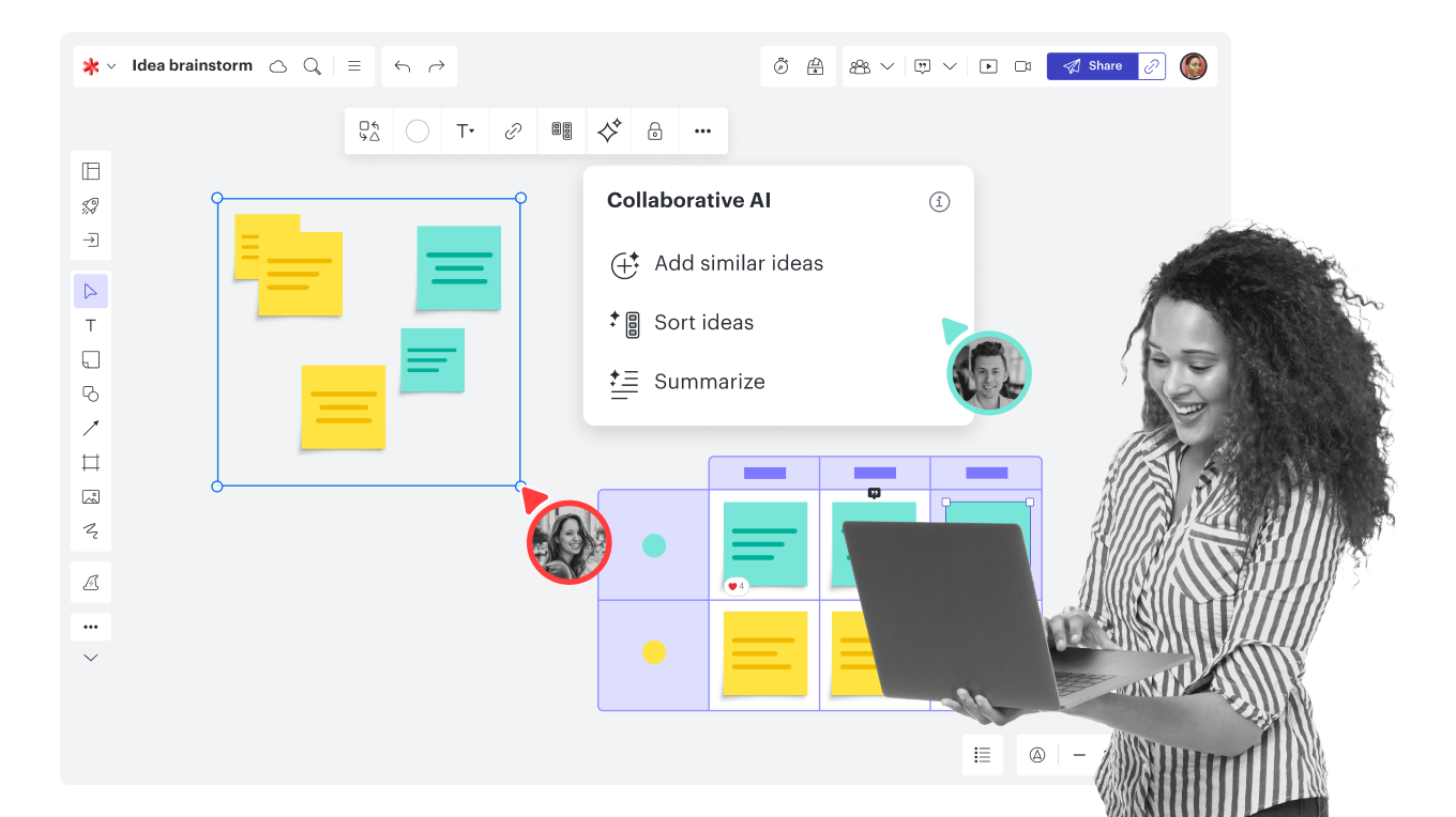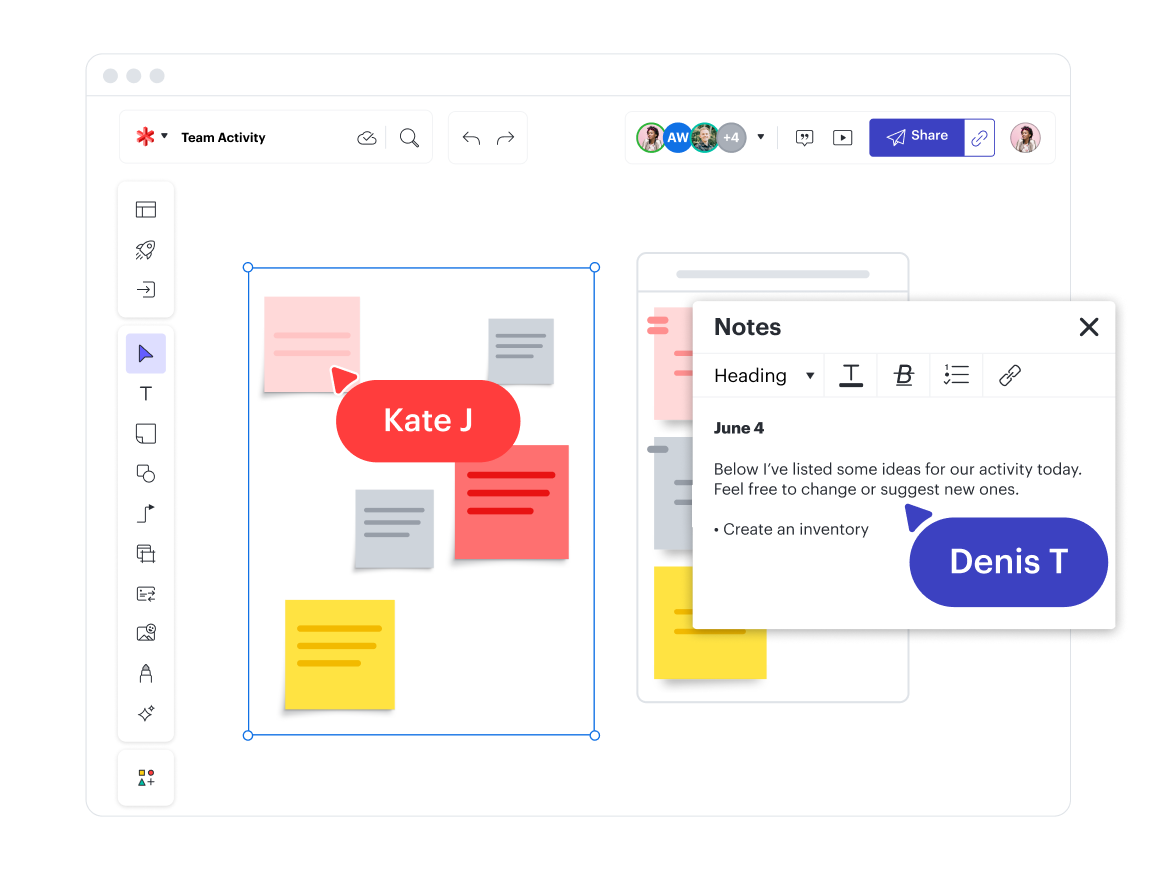 Ready to turn your ideas into action? The Lucidspark note panel and embedded comment features let you and your team map out action items and follow-ups without creating a separate document. Keep all of your copy, meetings notes, bullet points, and to-do lists together in one convenient location for you or your team to reference.