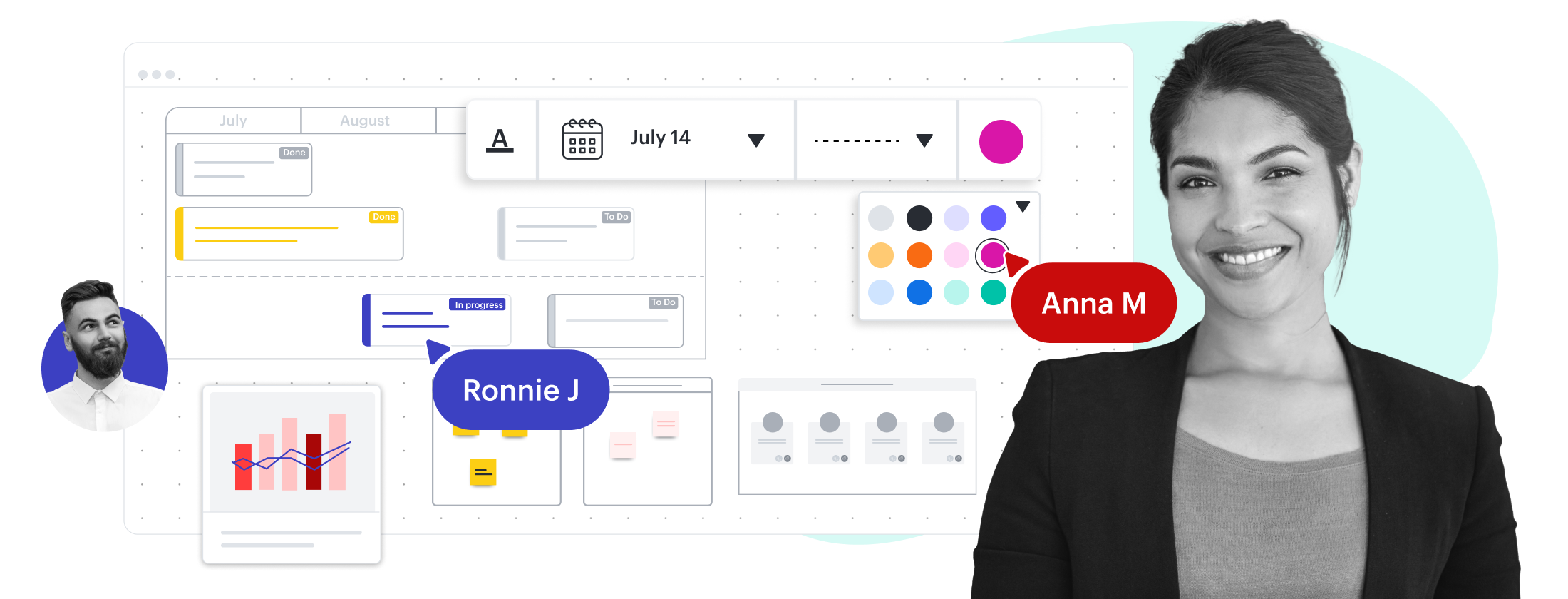 Create timelines to show past events or future plans. Add details such as status, assignee, or estimate.