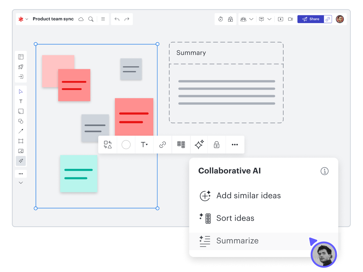 Go a step further by uncovering key themes with AI. Click to sort ideas, and your sticky notes will be grouped into categories within Containers. That’s where you’ll start to see the big picture.