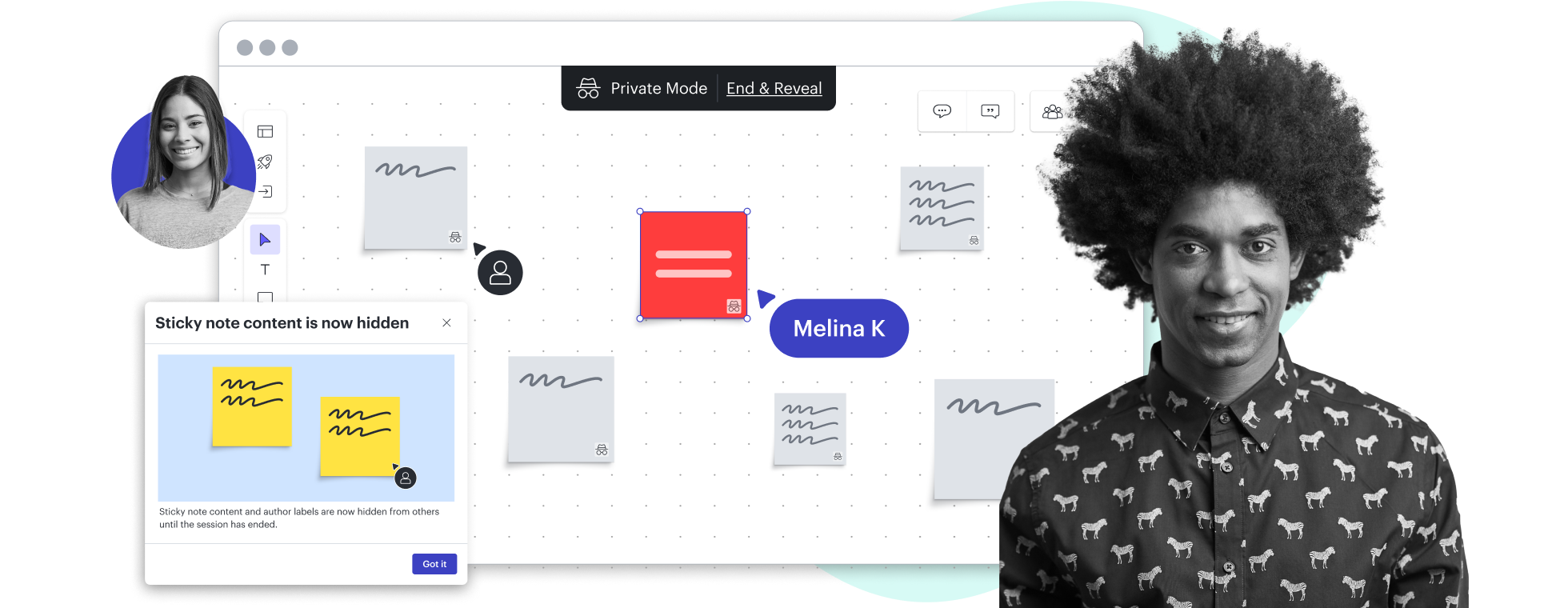 Foster creativity by minimizing distractions. Share a whiteboard, set a timer, and allow participants to quickly add ideas using sticky notes, images, and more.