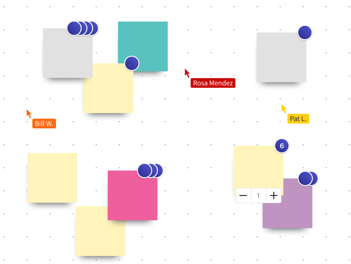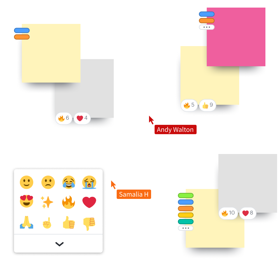 Organiseer realtime stemsessies en breng de resultaten automatisch in beeld. Stimuleer de participatie en motivatie van je team door iedereen een stem te geven. Wil je snel reageren op een idee? Voeg dan je favoriete emoji toe.