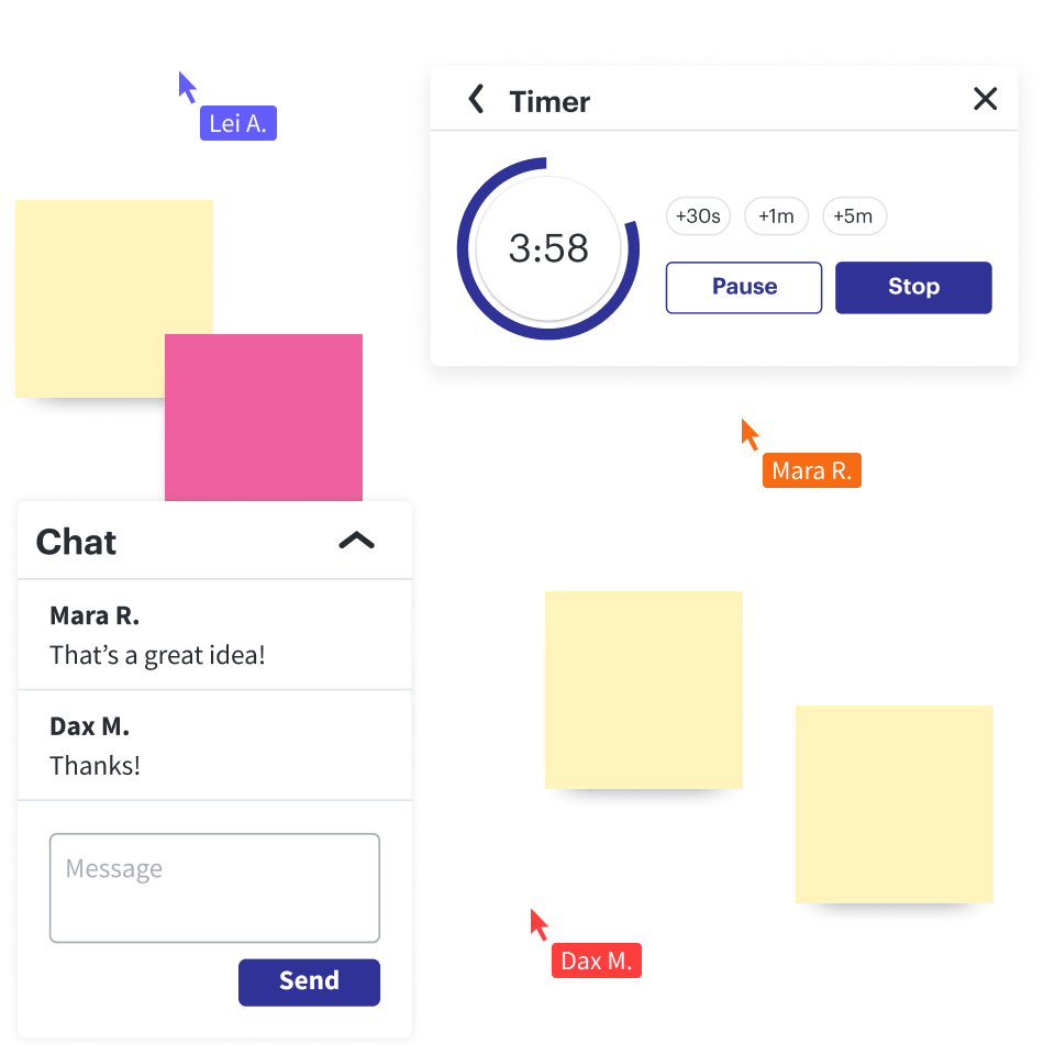 Haal alles uit samenwerkingssessies met de geïntegreerde chat- en stemfuncties en timers die iedereen betrokken en gefocust houden.