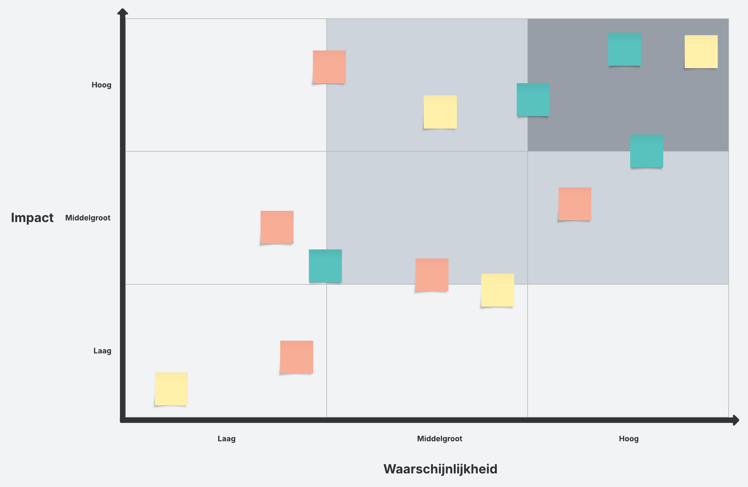 Het visualiseren van relaties heeft impact. De relatie tussen waarschijnlijkheid en impact is voor iedereen in je team veel duidelijker als deze wordt gevisualiseerd in een sjabloon voor 3x3-risicomatrix.
