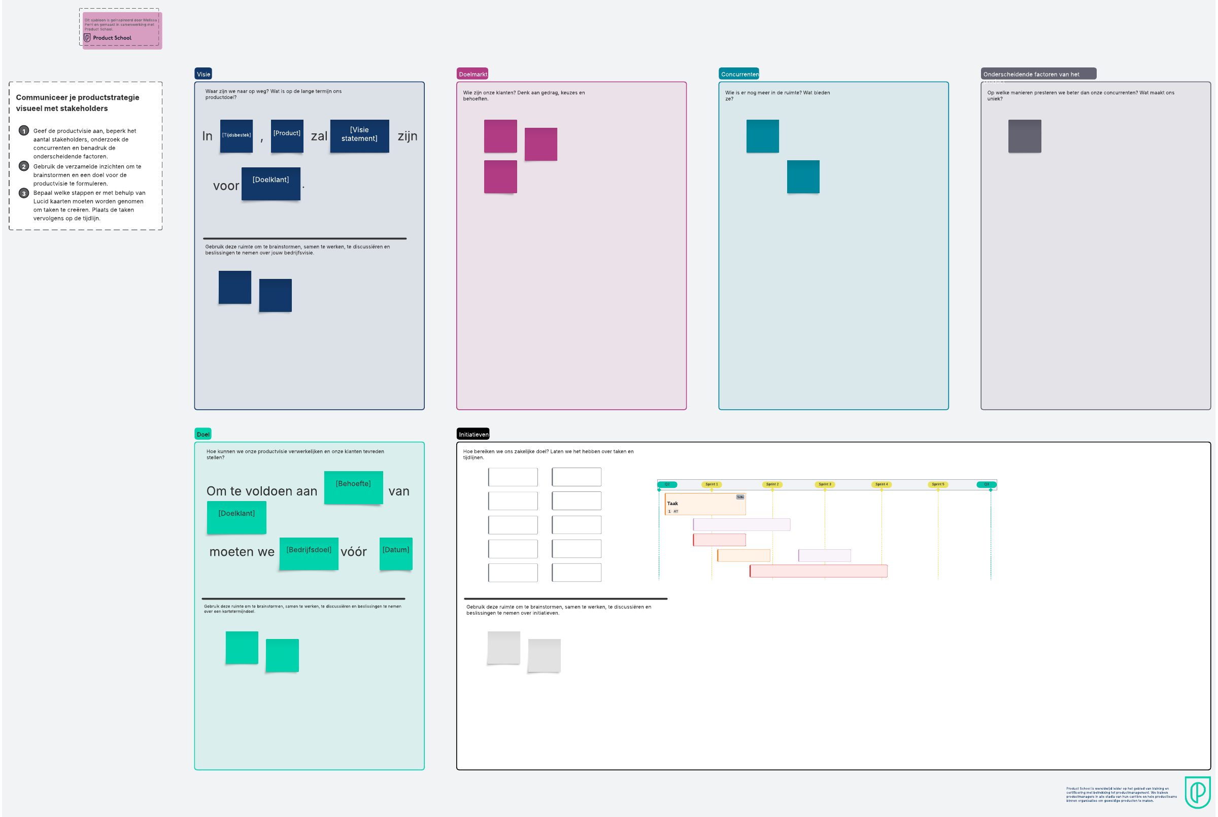Het canvas voor productstrategie is gemaakt in samenwerking met Product School, wereldwijd leider op het gebied van training en certificering met betrekking tot productmanagement. Gebruik dit sjabloon om de informatie over je productstrategie die je al bekend is, om te zetten in een actieplan.