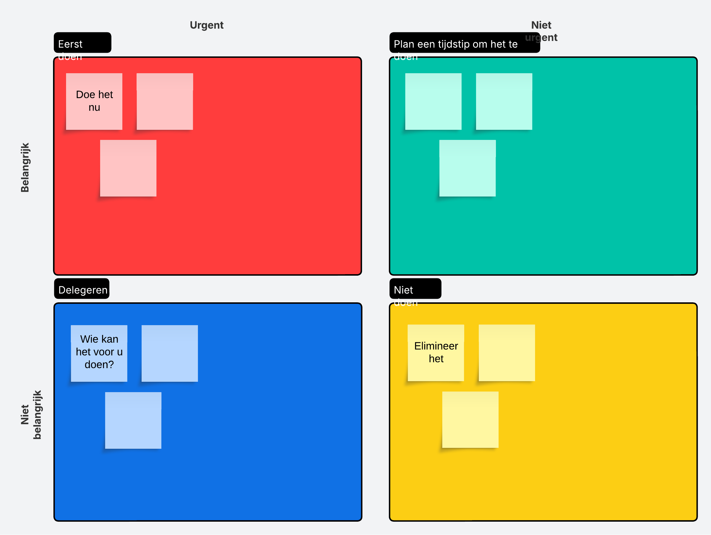 Niet doen: ten slotte kunnen alle taken die niet belangrijk of dringend zijn, in het kwadrant 'Niet doen' worden geplaatst. Dit kunnen afleidingen zijn, of taken die geen meetbare waarde hebben.