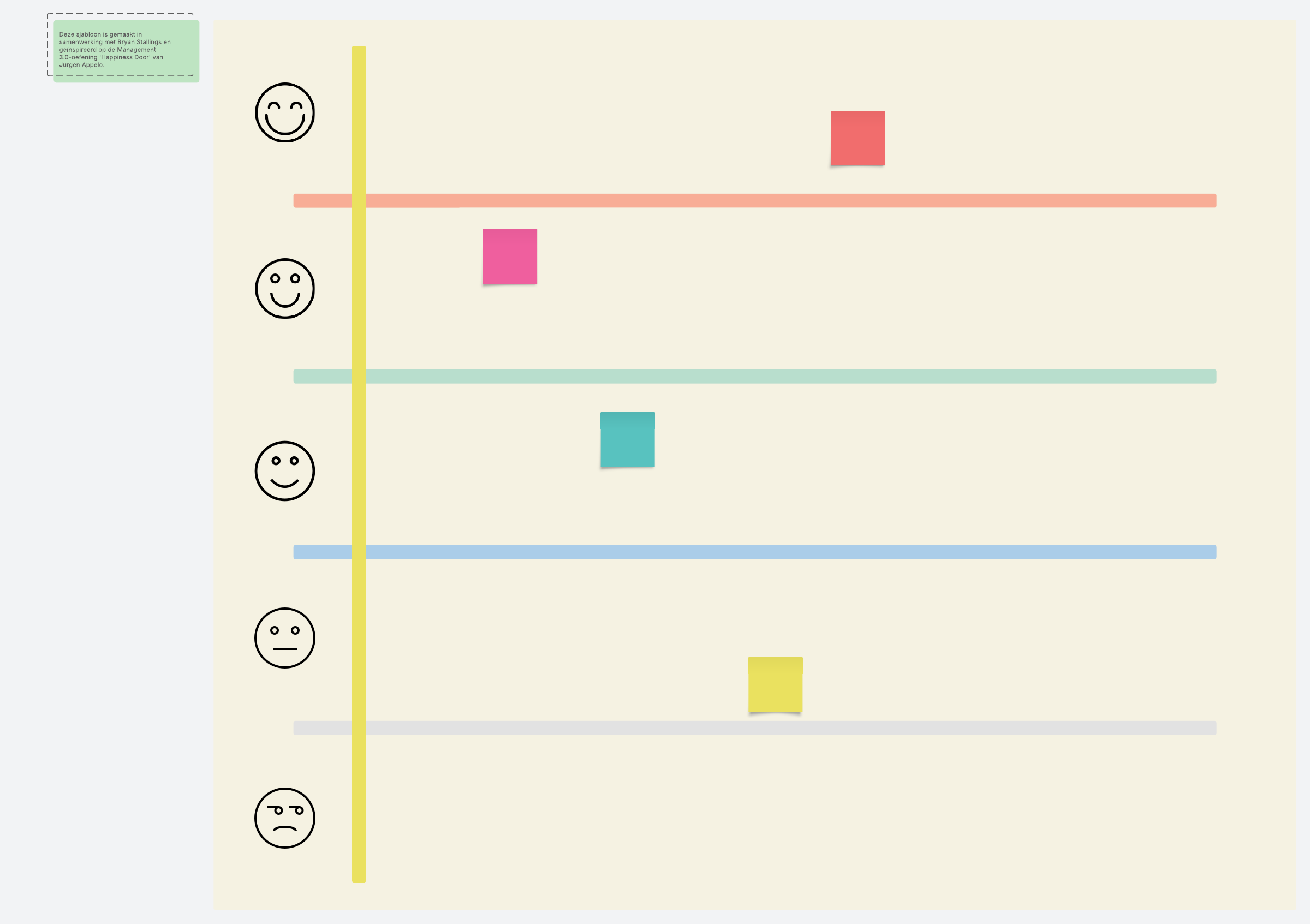 Laat deelnemers sticky notes gebruiken om feedback te geven aan de facilitator van je vergadering. Facilitators voegen deze feedbackmuursjabloon in het Lucidspark-whiteboard in en nodigen deelnemers uit om tijdens de sessie hun opmerkingen en suggesties achter te laten.
