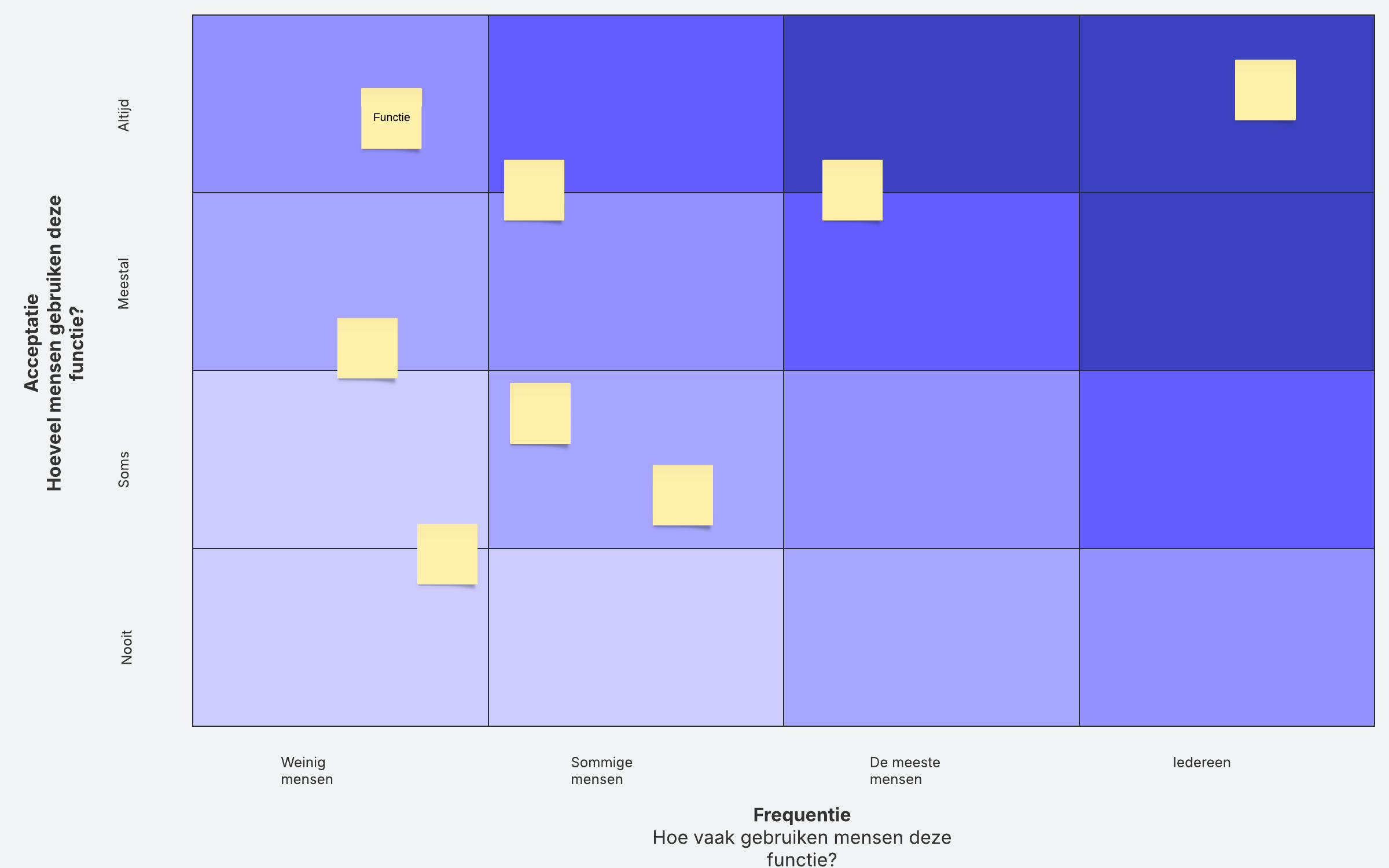 Voer een functie-audit uit om je te richten op de functies die het belangrijkst voor u zijn. Voeg je functies toe aan de matrix volgens hun frequentie en acceptatie.