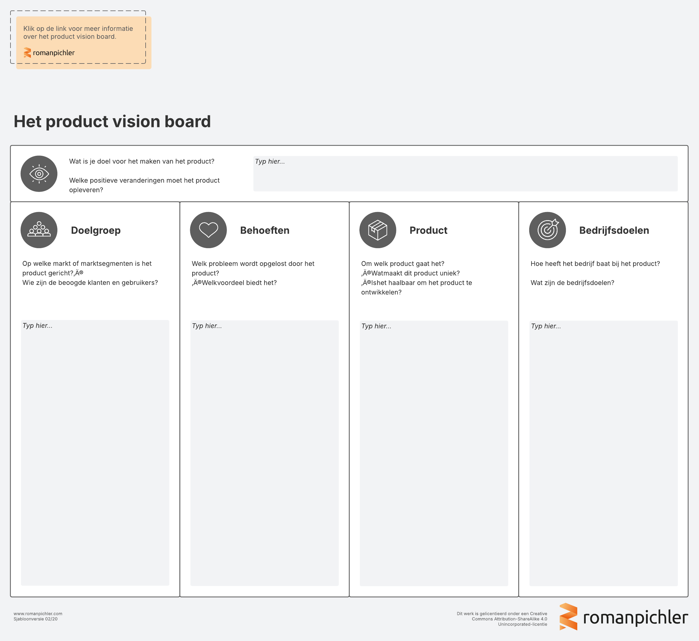 Gebruik dit product vision board, oorspronkelijk ontwikkeld door productmanagementexpert Roman Pichler, om je productvisie en -strategie te beschrijven. Leg belangrijke details over je doelgroep, gebruikersbehoefte, producteigenschappen en bedrijfsdoelen centraal vast.