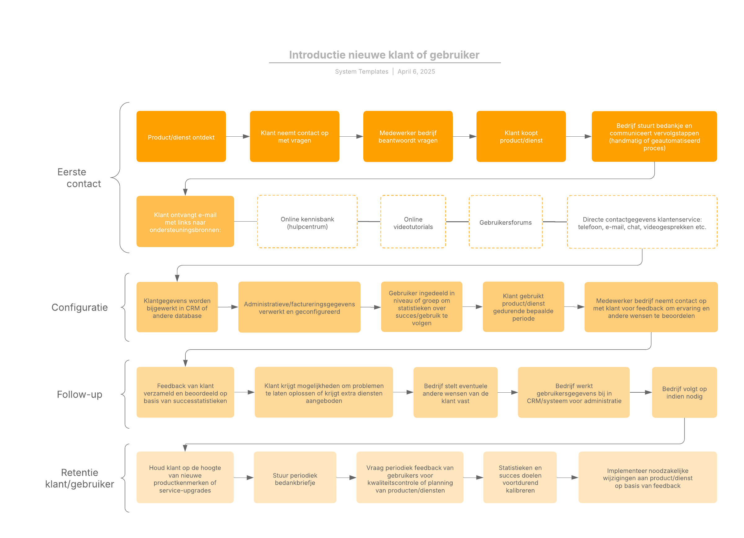 Dit stroomdiagram illustreert de eindgebruikerservaring bij de introductie van een nieuwe klant of gebruiker.