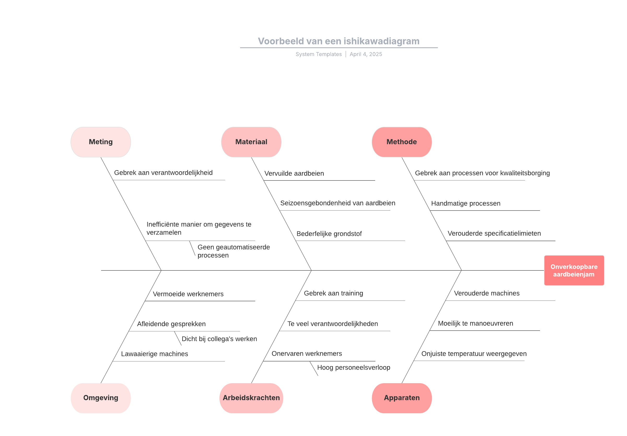 Open deze sjabloon voor een gedetailleerd voorbeeld van een ishikawa diagram dat je aan jouw use case kunt aanpassen.