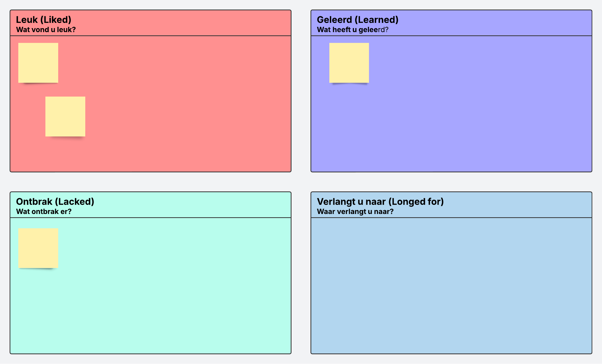 Organiseer sprint- en projectretrospectieven met deze 4L-sjabloon. Bespreek samen met je team wat je leuk vond, wat je hebt geleerd, wat er nog ontbrak en waar je naar verlangde, en gebruik deze inzichten voor het volgende project.