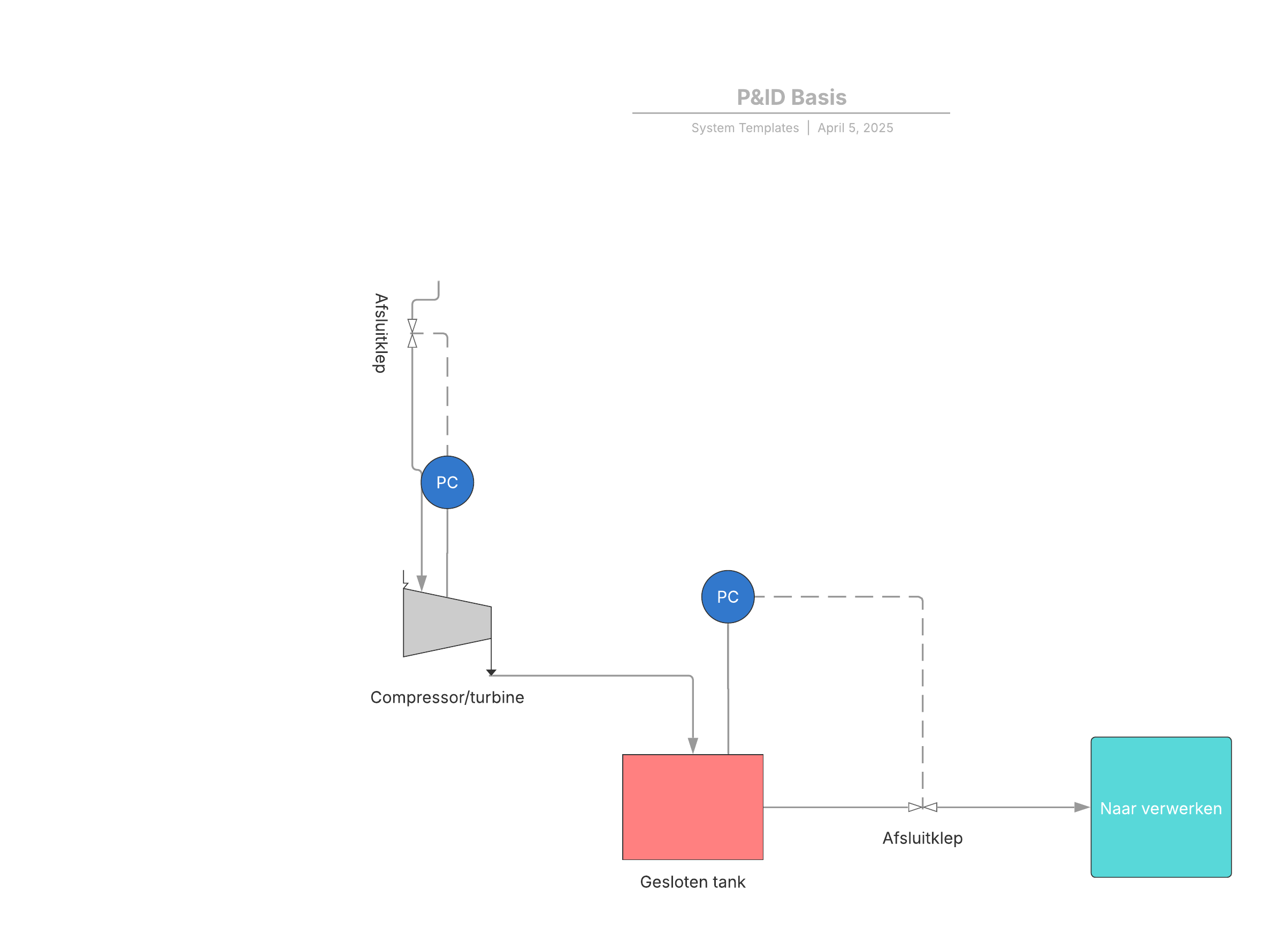 Open dit sjabloon voor een gedetailleerd voorbeeld van een basis-P&ID-diagram dat u kunt aanpassen op uw use case.