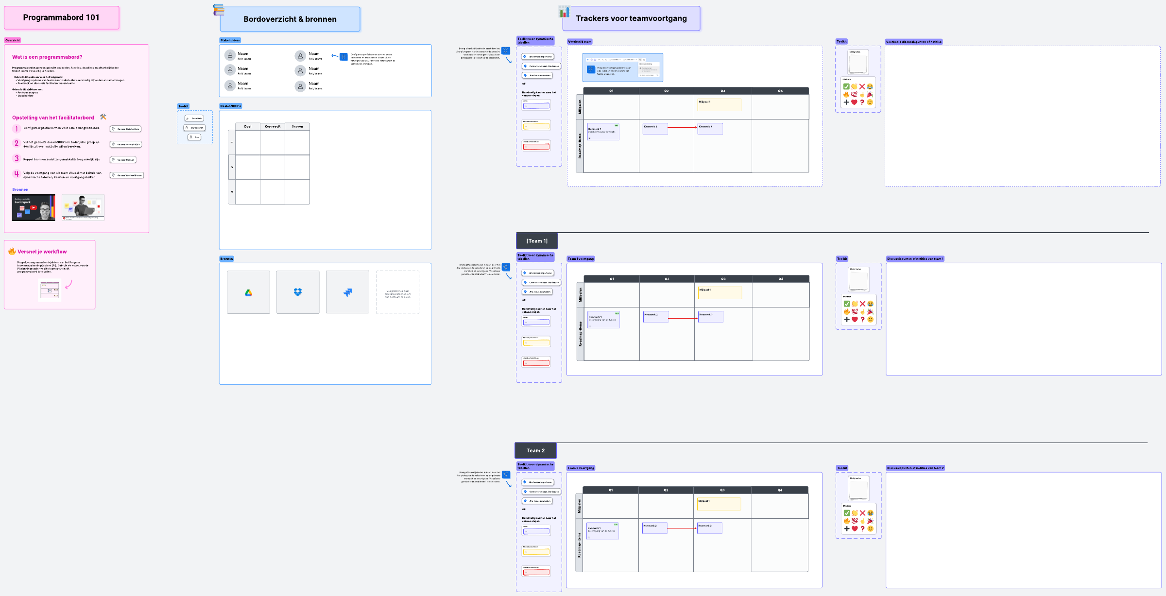 Stroomlijn informatie van verschillende teams op één locatie door gebruik te maken van dit dashboard voor programmacoördinatie, dat is ontworpen om belangrijke informatie aan stakeholders te tonen en het bijwerken van updates te vereenvoudigen.