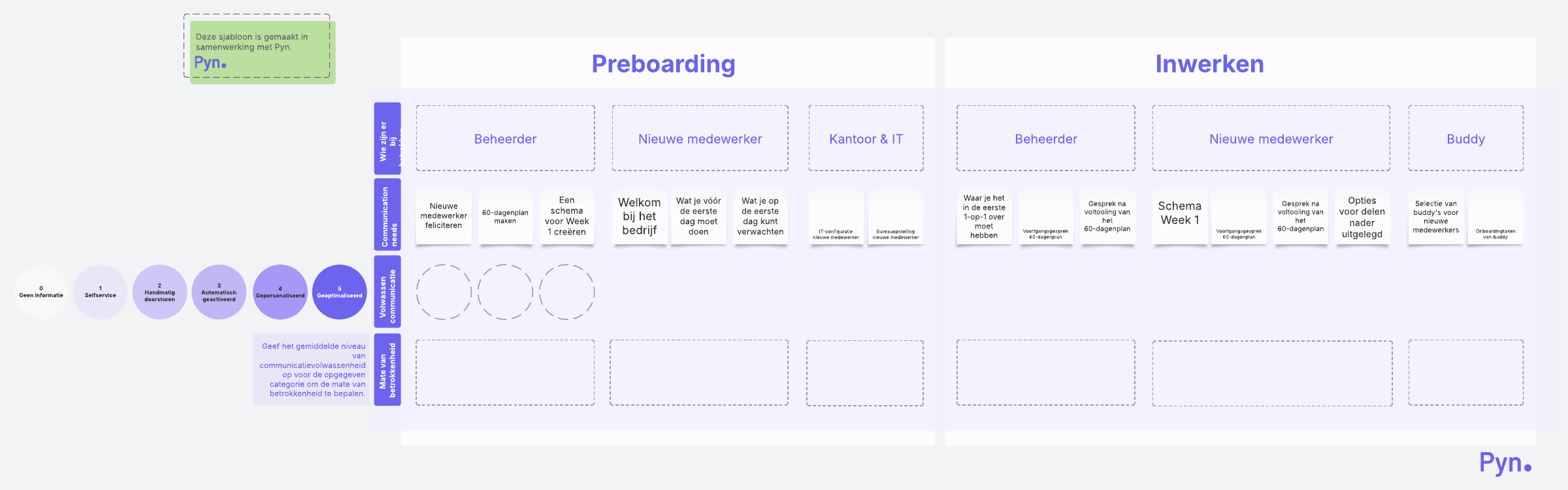 Analyseer het hele traject dat nieuwe medewerkers afleggen, van preboarding tot onboarding, met deze sjabloon van Pyn voor de medewerkersreis.