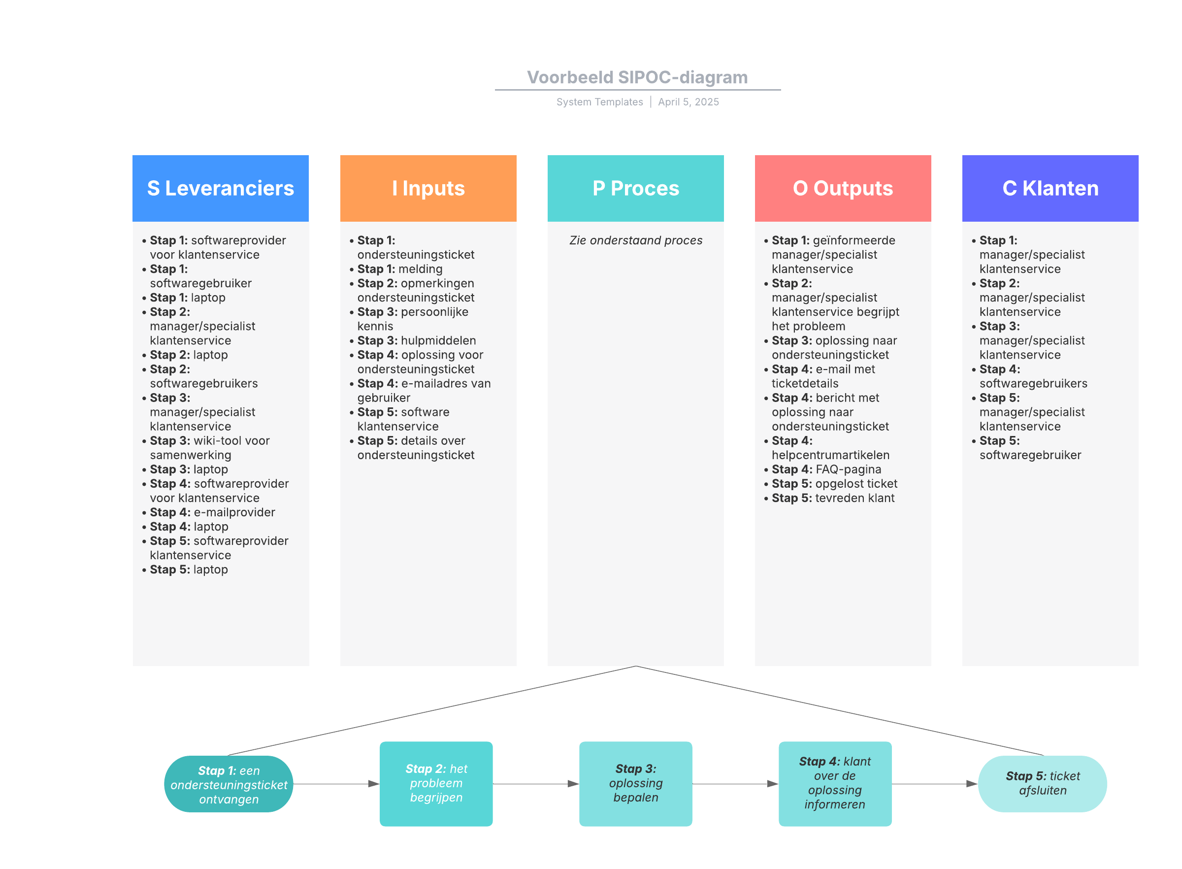 Open het template voor een gedetailleerd voorbeeld van een SIPOC-diagram dat je aan jouw use case kunt aanpassen.