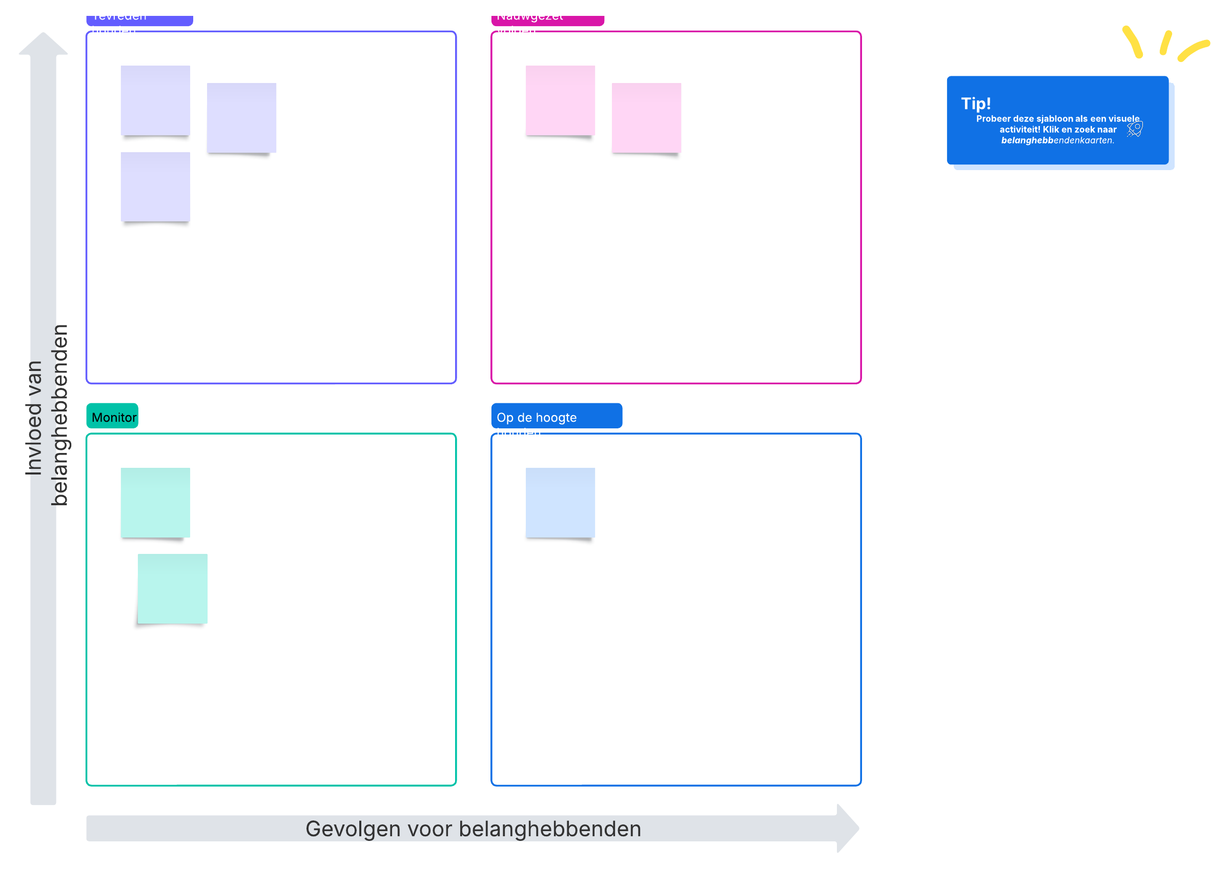 Open deze sjabloon voor een gedetailleerd voorbeeld van een stakeholder matrix die je kunt aanpassen aan je use case.