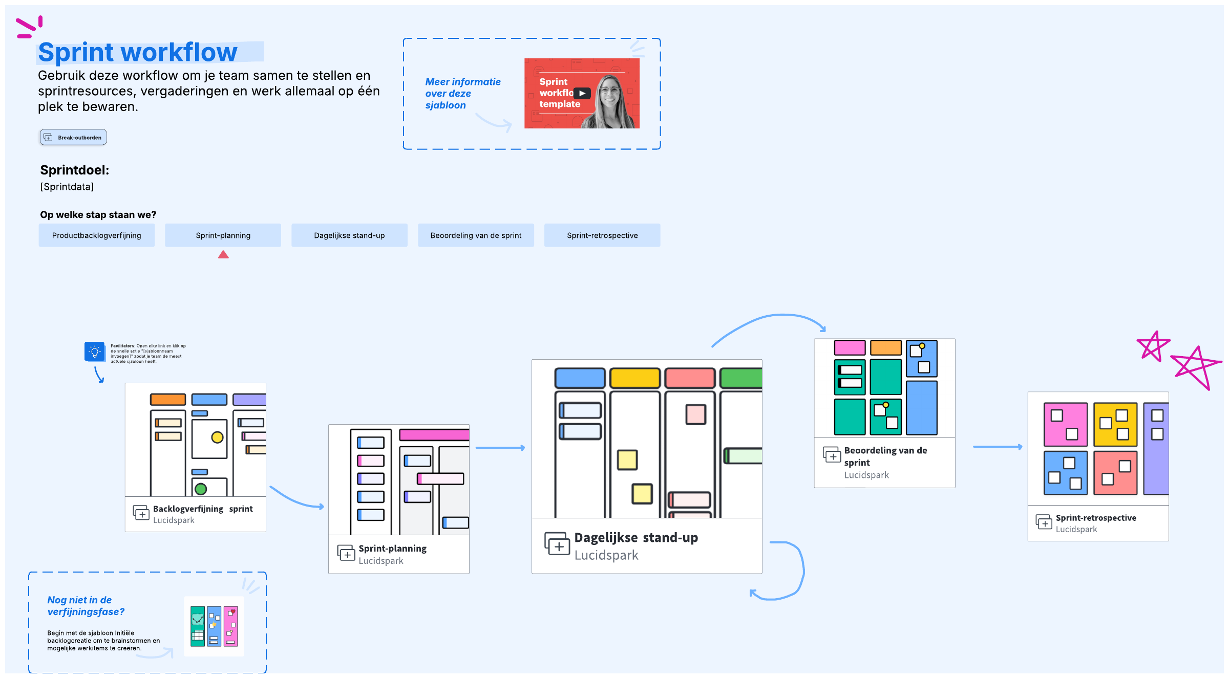 Stroomlijn alle Agile gebeurtenissen in je sprint overzichtelijk op één plek met deze sjabloon. Hij is vooraf geconfigureerd om je product backlogverfijning, sprintinschatting, sprintplanning, dagelijkse standups, sprintreview en retrospective te ondersteunen in één board.