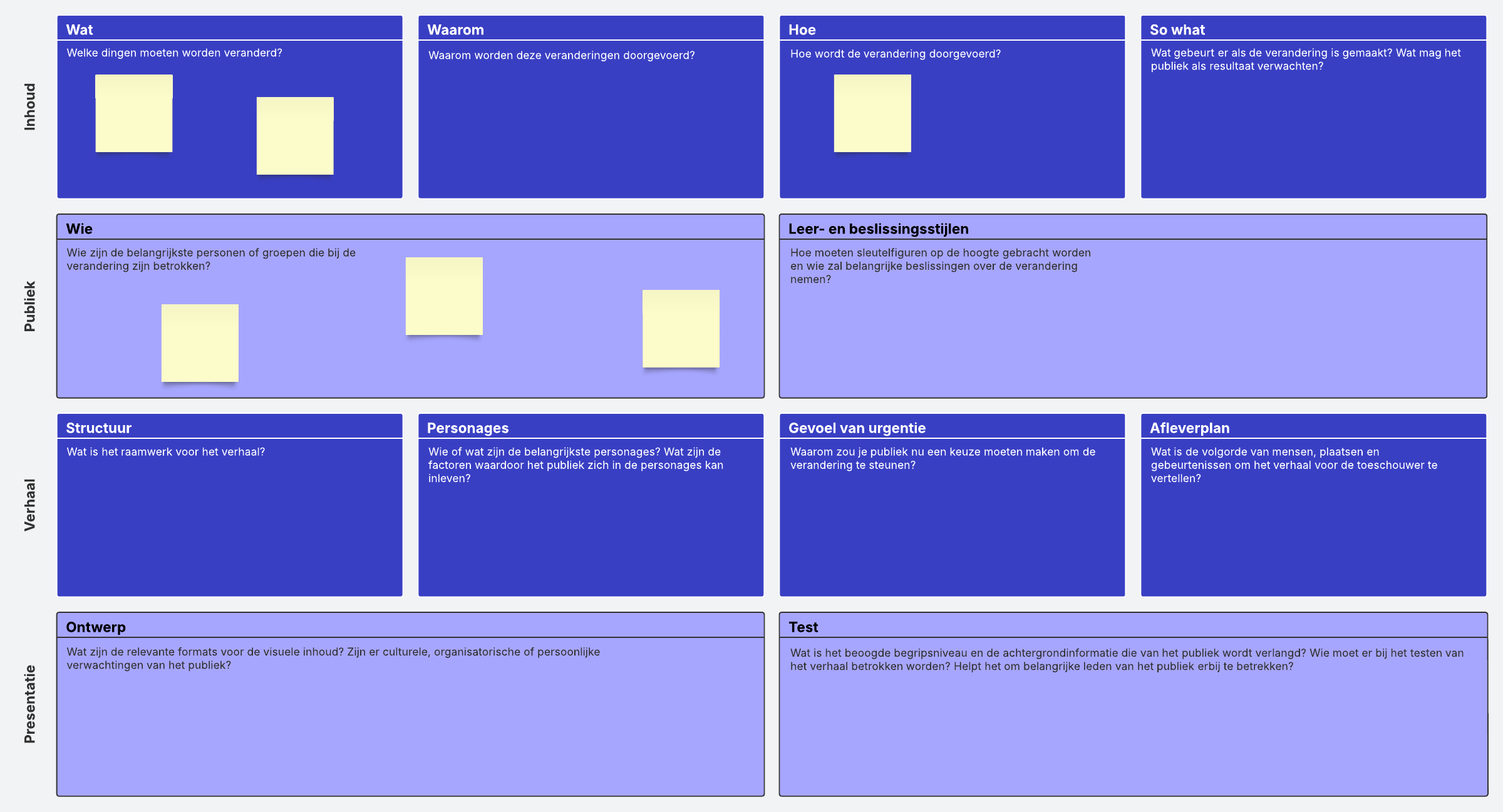 Plan en schets belangrijke veranderingen voor je publiek (product, proces, enz.). Wees specifiek over deze veranderingen en hoe het verhaal zowel structureel als visueel verteld moet worden.