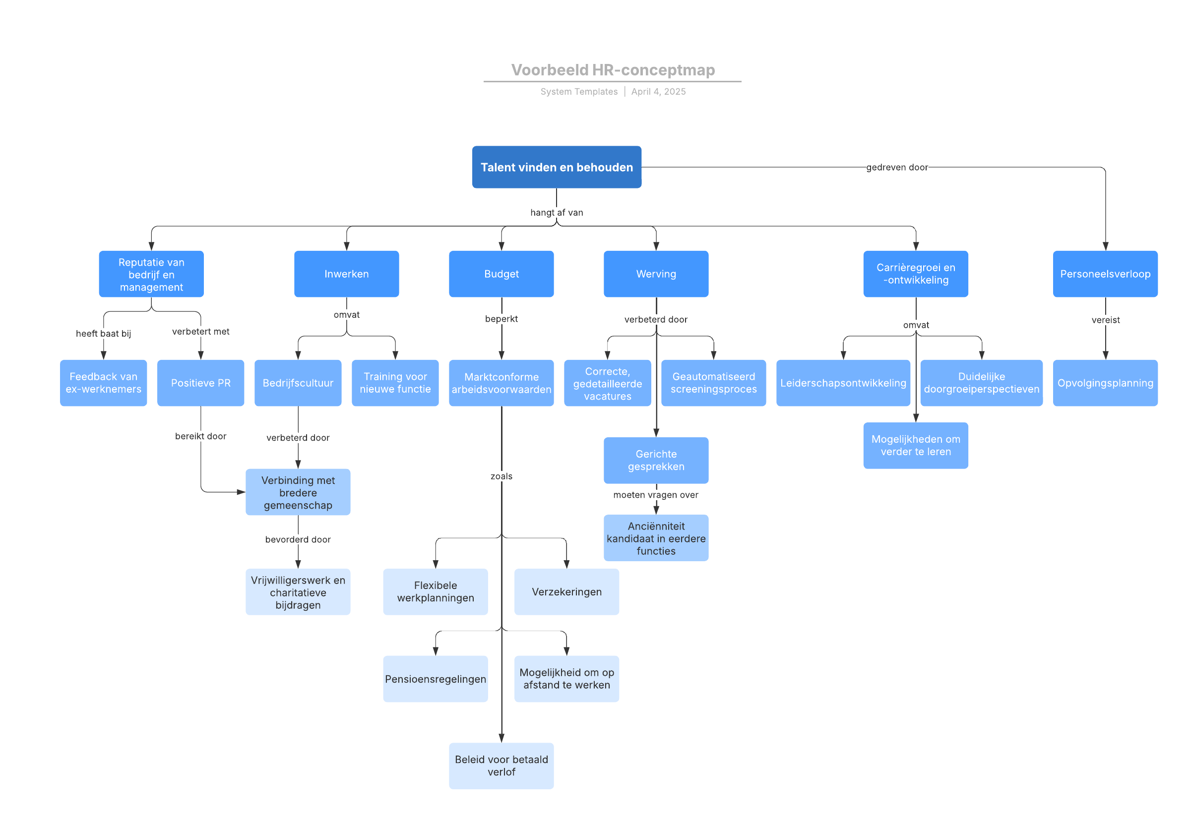 Open deze sjabloon voor een gedetailleerd voorbeeld van een HR-conceptmap die u kunt aanpassen aan uw use case.