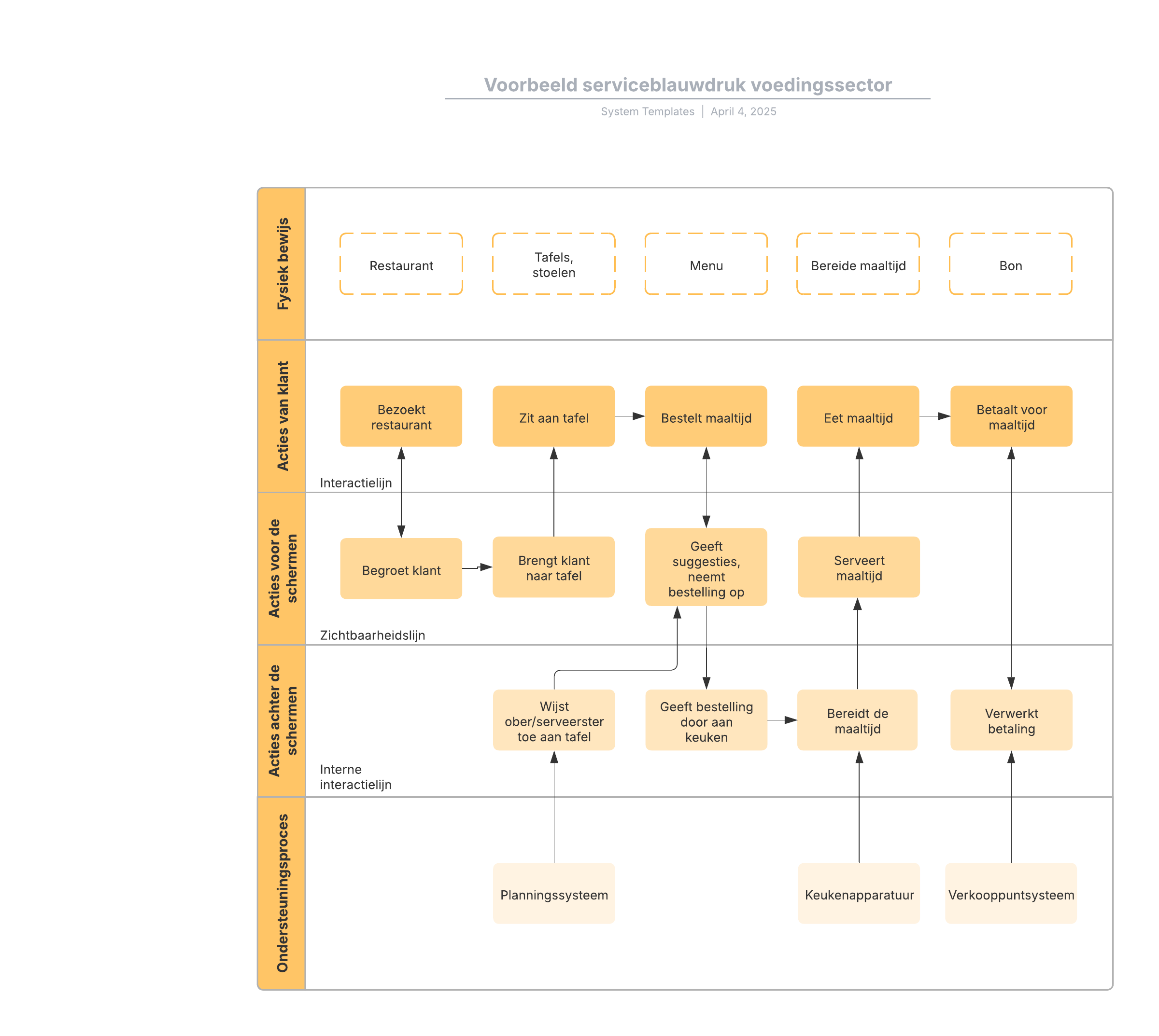 Open deze sjabloon voor een gedetailleerd voorbeeld van een serviceblauwdruk voor de voedingssector die u kunt aanpassen aan uw eigen gebruiksvoorbeeld.