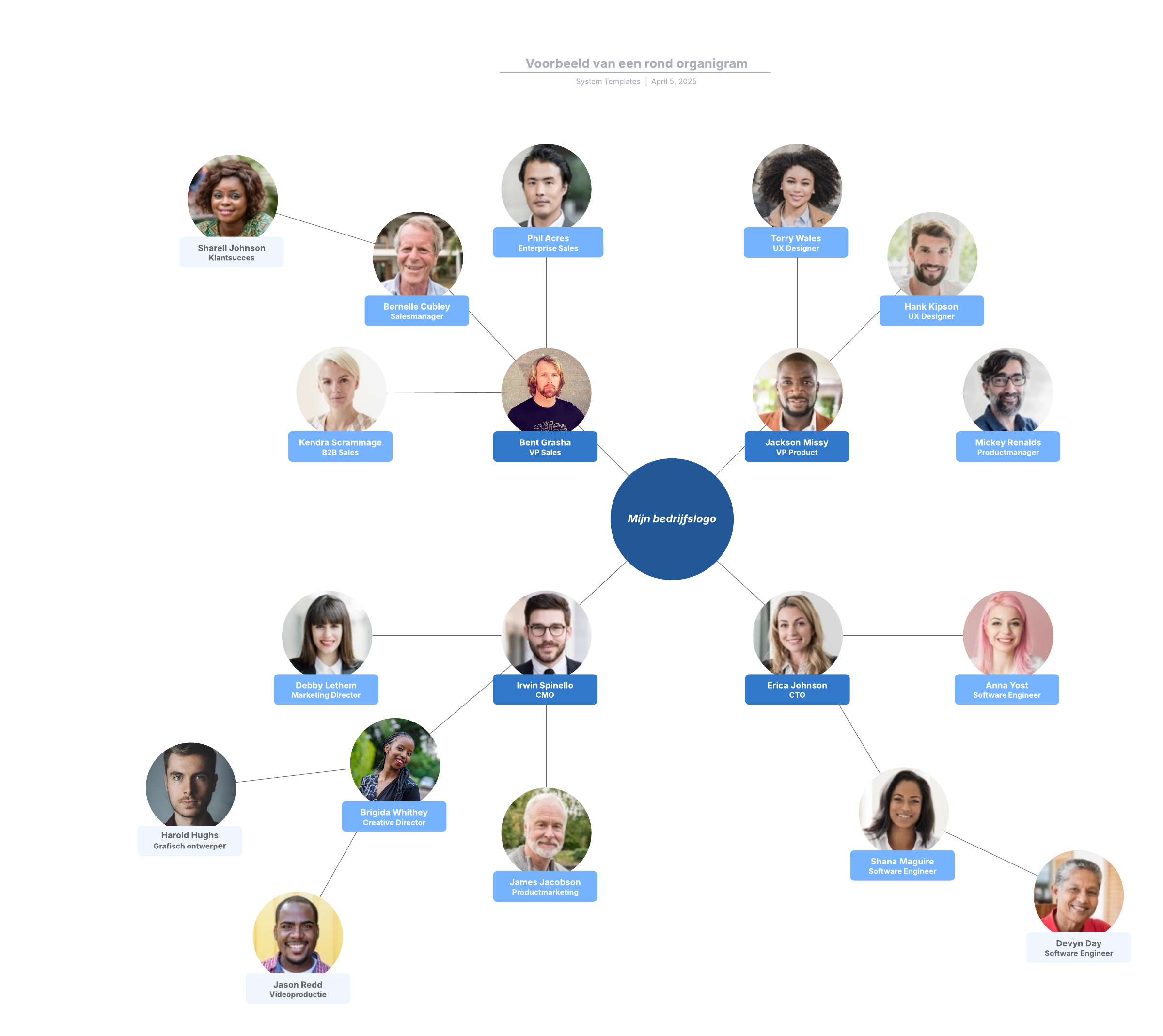 Open deze sjabloon voor een gedetailleerd voorbeeld van een rond organigram dat u kunt aanpassen op uw use case.