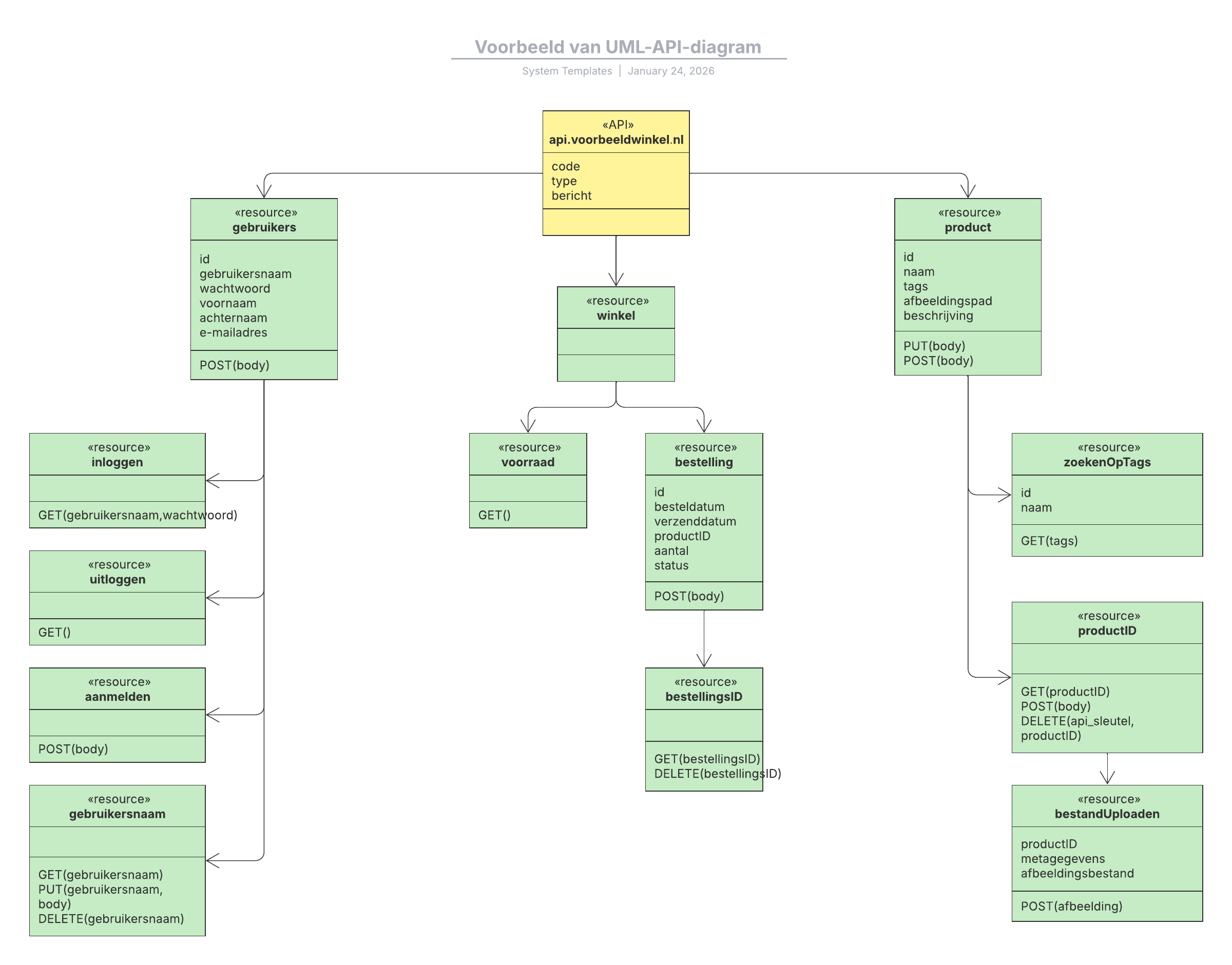 Open deze sjabloon voor een gedetailleerd voorbeeld van een UML-API-diagram dat u kunt aanpassen op uw use case.