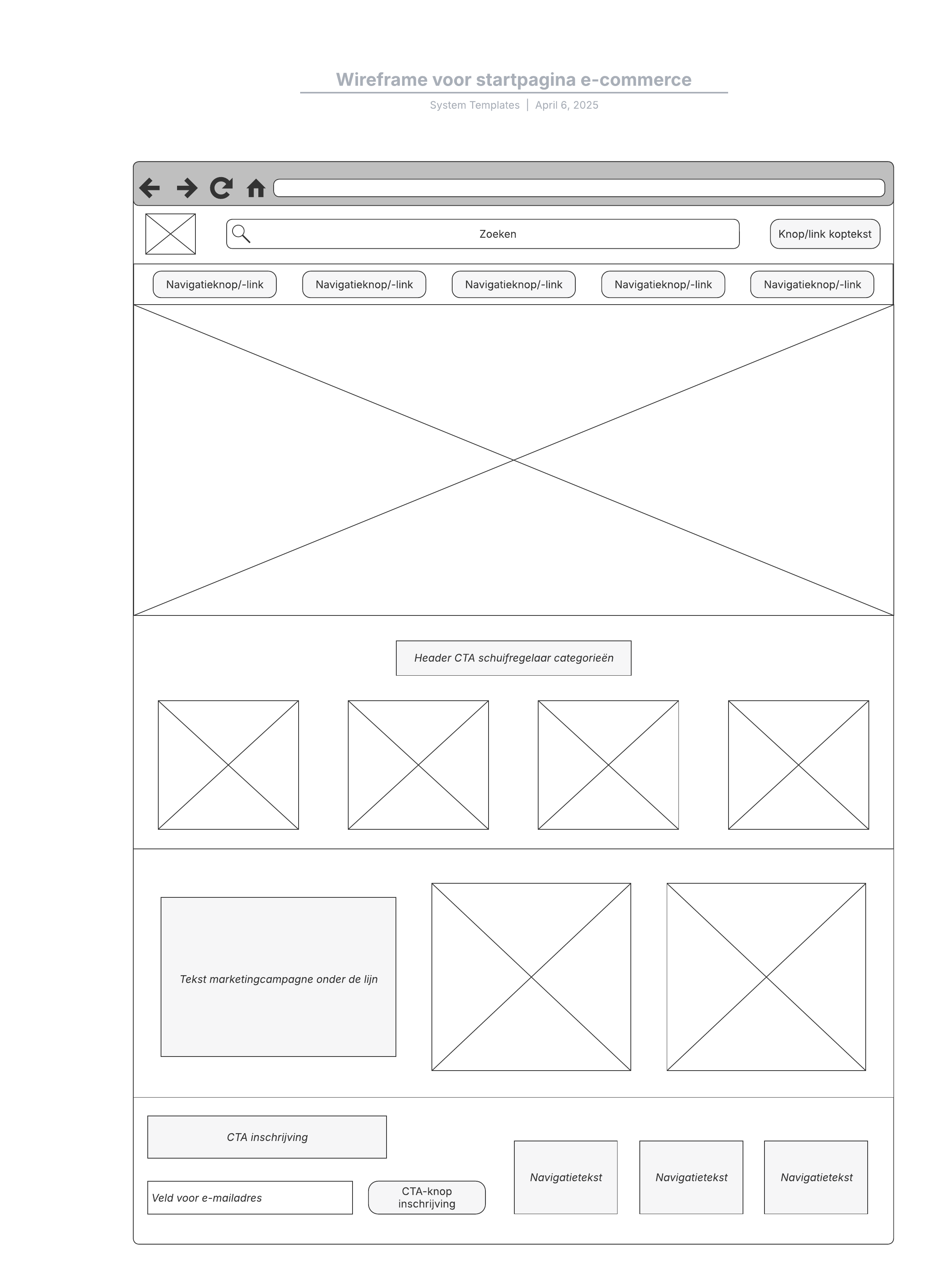Met deze eenvoudige wireframesjabloon voor een e-commercestartpagina kunt u: