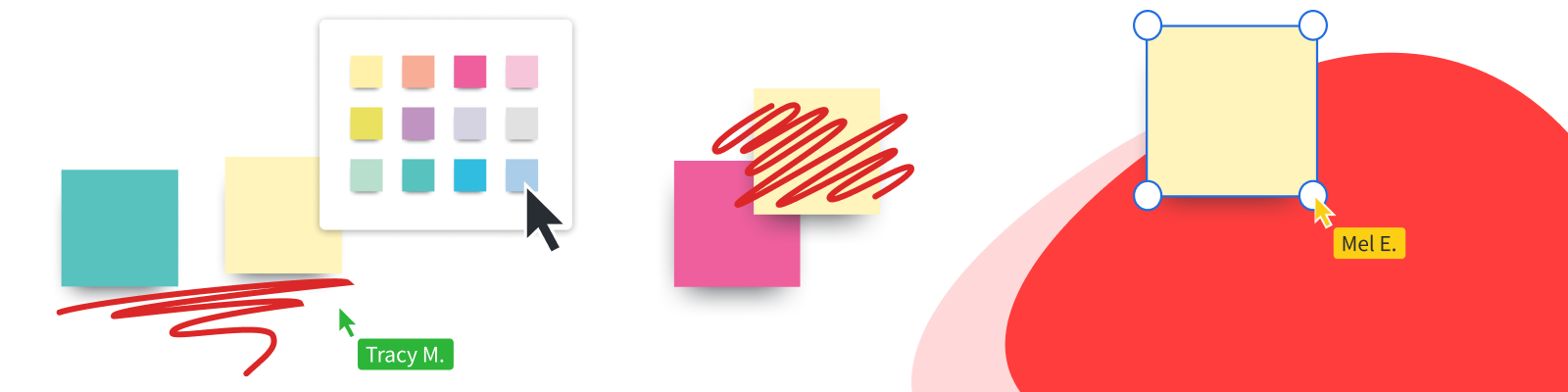 - Karteczki samoprzylepne: karteczki samoprzylepne są sprawdzonym narzędziem do burzy mózgów, służącym do zapisywania i porządkowania pomysłów, zwykle na tablicy. Można je łatwo dopasować kolorystycznie, edytować, usuwać, zmieniać kolejność i nie tylko, aby dokładnie przedstawić swoje pomysły. Można też korzystać z nich wirtualnie, używając programu takiego jak Lucidspark. Wystarczy zamieścić informacje na swojej karteczce online lub załadować tekst z arkusza CSV lub Excel, aby tworzyć karteczki samoprzylepne w dużych ilościach.