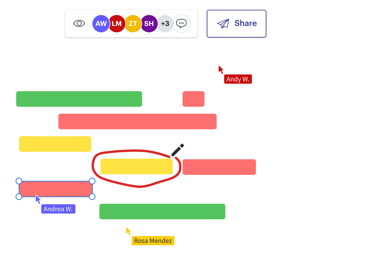 Usprawnij zdalne spotkania robocze, sesje planowania sprintu i retrospektywy za pomocą elastycznych narzędzi, które spełnią potrzeby Twojego zespołu. Wygodne szablony w połączeniu z opcjami rysowania odręcznego ułatwiają Twojemu zespołowi współpracę online w czasie rzeczywistym.