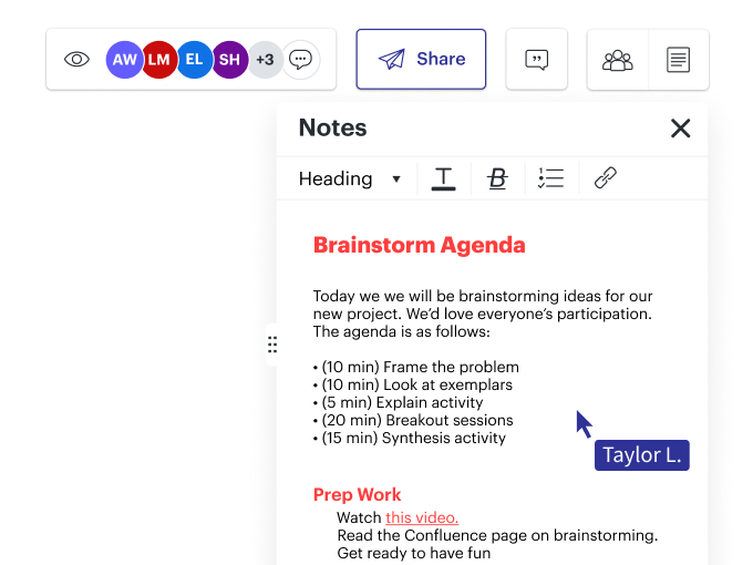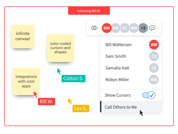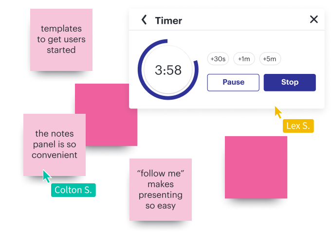Gromadź wnioski zespołu, korzystając z notatek samoprzylepnych, funkcji rysowania odręcznego oraz oznaczonych kolorami kursorów, kształtów i linii każdego współpracownika. Pracujcie razem na nieograniczonym obszarze roboczym, na którym zmieszczą się nawet najśmielsze pomysły.