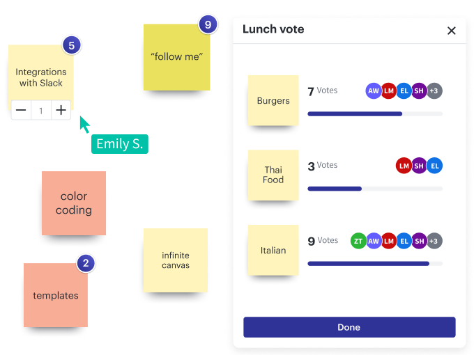 Nie pozwól, aby Twoja ciężka praca poszła na marne. Wykorzystaj swoje zapiski i karteczki samoprzylepne i przekształć je w kolejne kroki, głosując nad pomysłami, grupując spostrzeżenia według tematów i trendów oraz tworząc procesy robocze i dokumentację projektu.