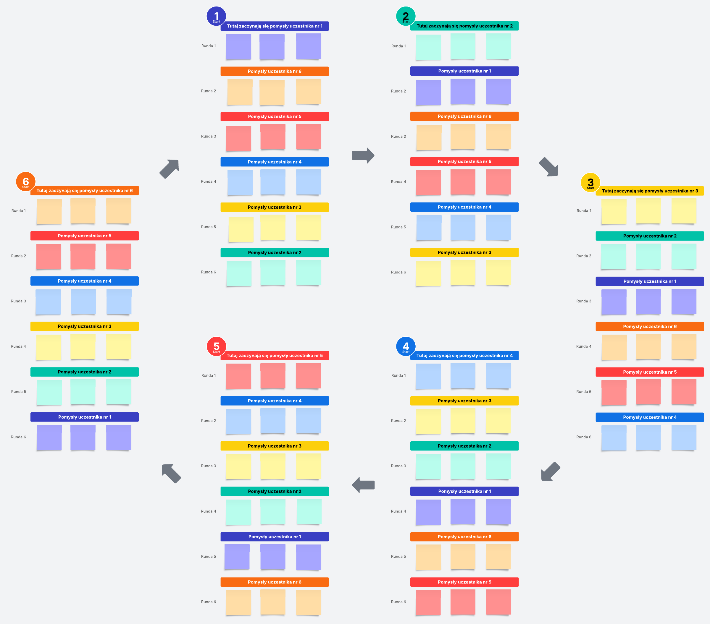 Chcesz zebrać mnóstwo pomysłów? Wypróbuj metodę brainwriting 6-3-5. Zgromadź sześć osób i poproś je, by w ciągu pięciu minut zapisały trzy pomysły. Powtórz ten proces jeszcze sześć razy, a następnie podejmij decyzje, które będą konieczne.