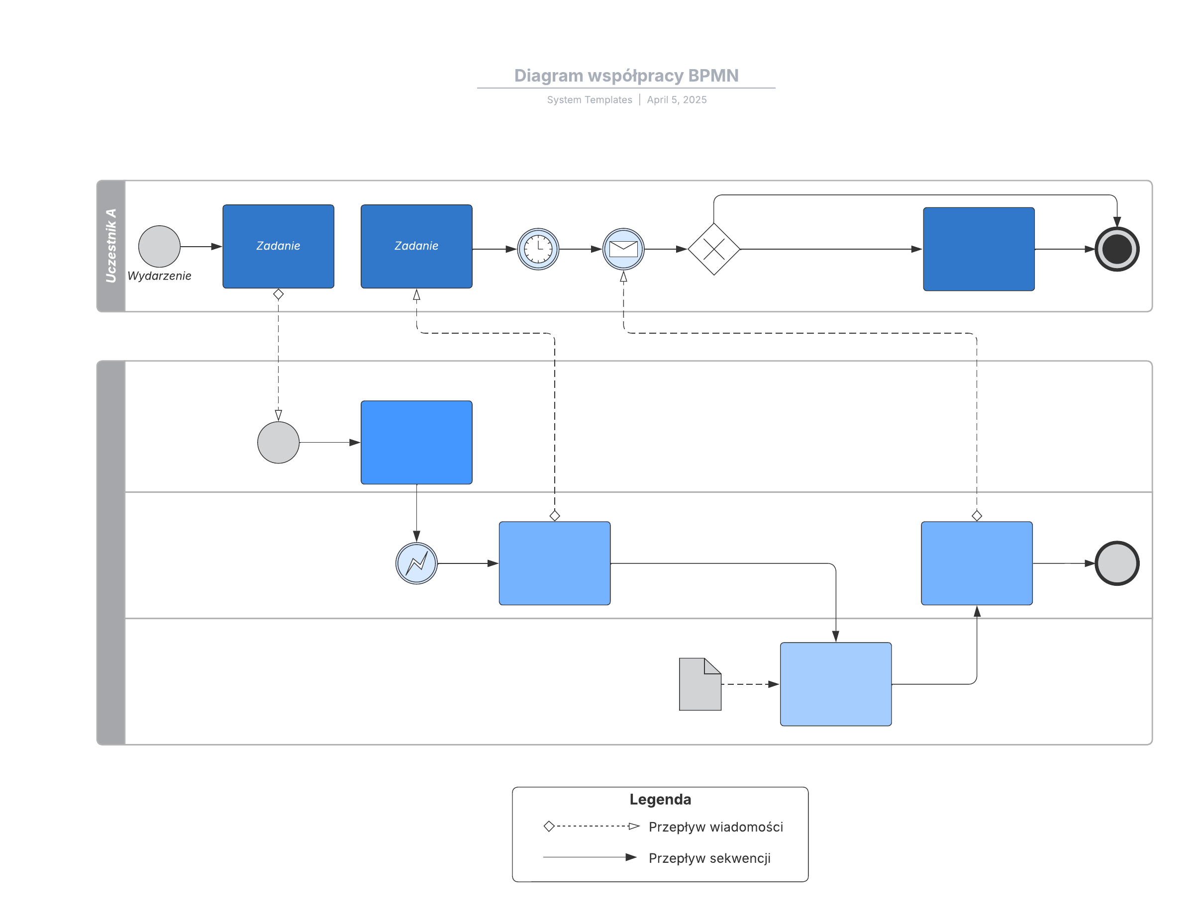 Otwórz ten szablon i dodaj zawartość, aby dostosować diagram współpracy BPMN do swojego przypadku użycia.