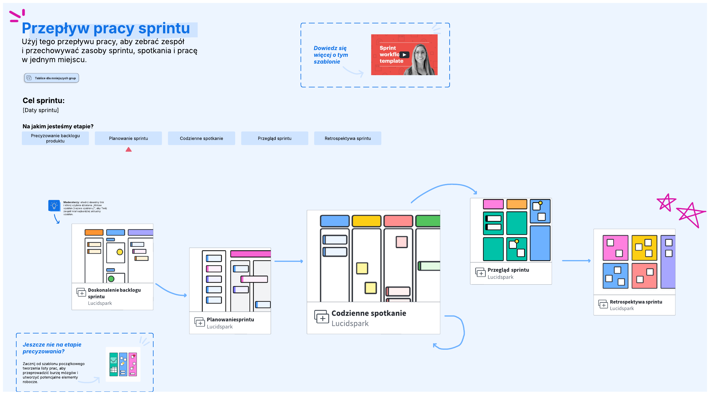 Usprawnij wszystkie zdarzenia agile w sprincie, wygodnie umieszczając je w jednym miejscu dzięki temu szablonowi. Jest on wstępnie skonfigurowany, aby zaledwie jedna tablica mogła pomóc precyzować backlog produktu, szacować i planować sprint, ustalać codzienne spotkania, rewidować sprint i retrospektywę.