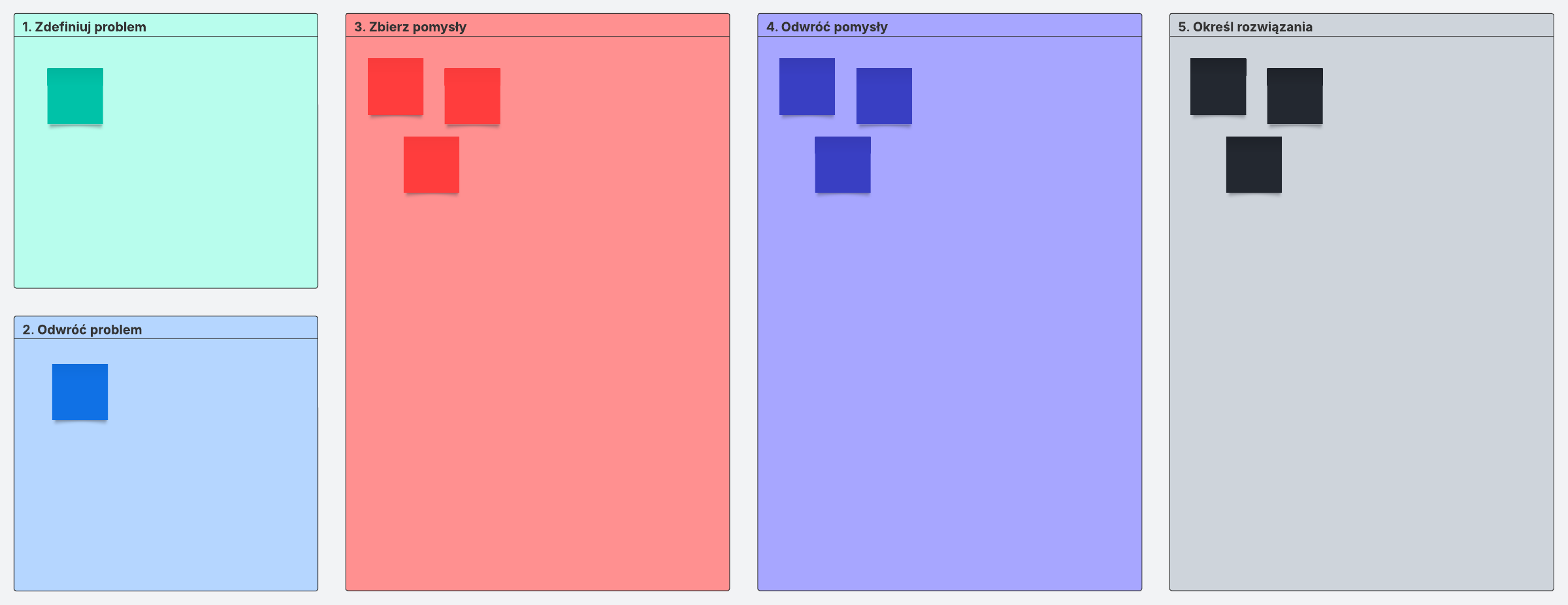 Dzięki odwróconej burzy mózgów Twój zespół zaczyna działania od skupienia się na problemach, a następnie tworzy rozwiązania. Po odwróceniu sposobu podejścia do problemu uczestnicy badają przyczyny i skutki, a następnie zbierają pomysły i określają potencjalne rozwiązania.