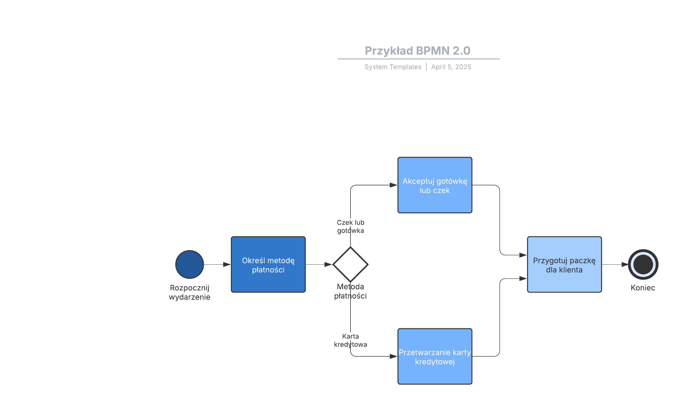 Otwórz ten szablon, aby zobaczyć szczegółowy przykład diagramu BPMN 2.0, który możesz dostosować do swojego przypadku użycia.