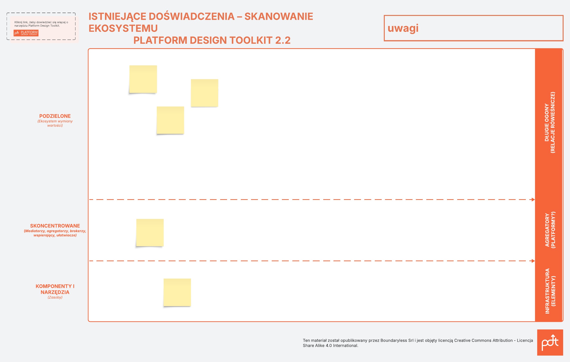 Ta metoda skanowania ekosystemu ujednolica zespół i pomaga zobrazować wskaźniki ekosystemu. Opracuj mapę elementów ekosystemu, podmiotów i elementów z warstwową abstrakcją rynku (rynki „długiego ogona”, elementy agregujące i infrastruktura).