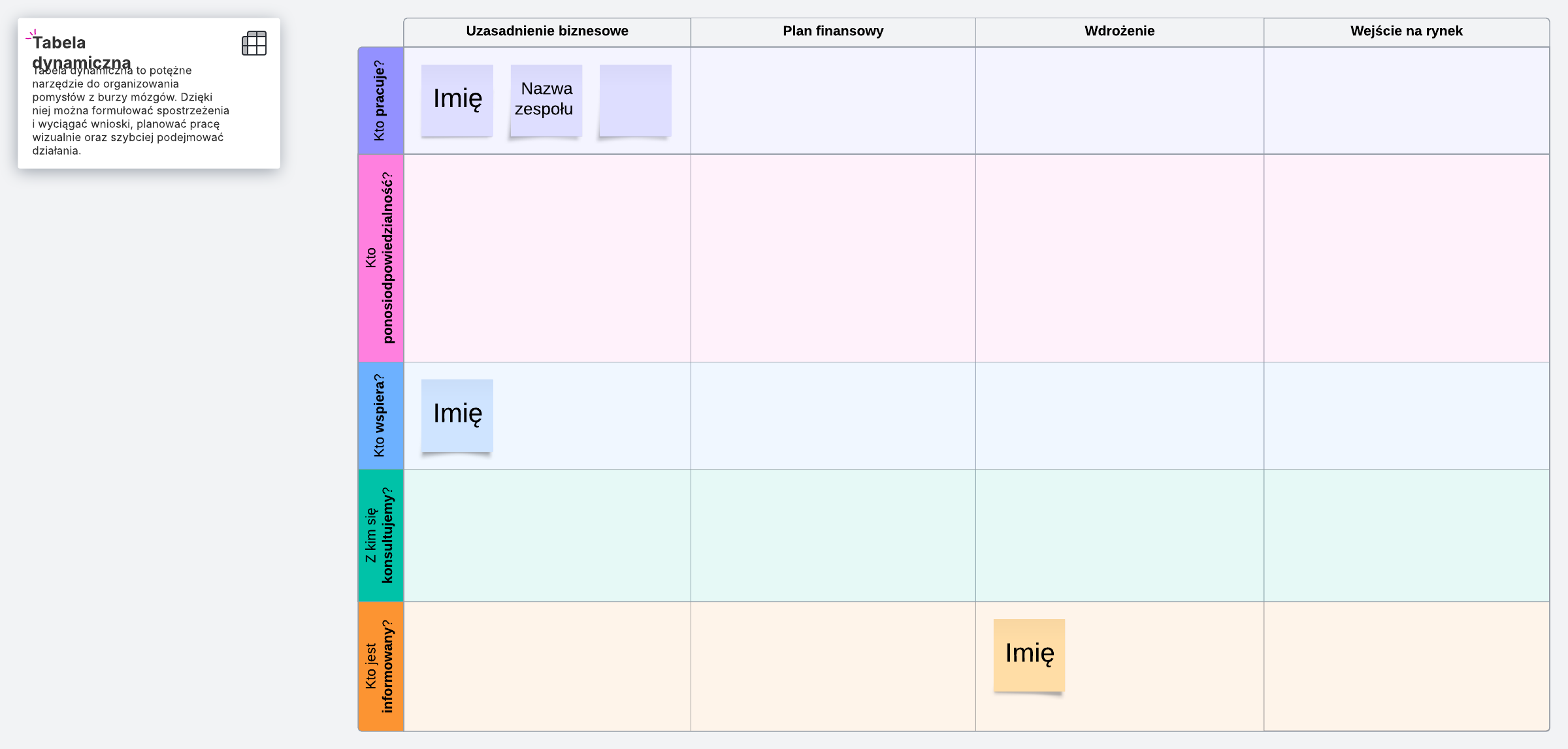 Użyj karteczek samoprzylepnych, aby umieścić odpowiednie nazwiska i zespoły we właściwych polach. To, czyje nazwiska znajdą się w którym polu, zostanie określone zgodnie z poniższymi wytycznymi dla każdego wiersza: