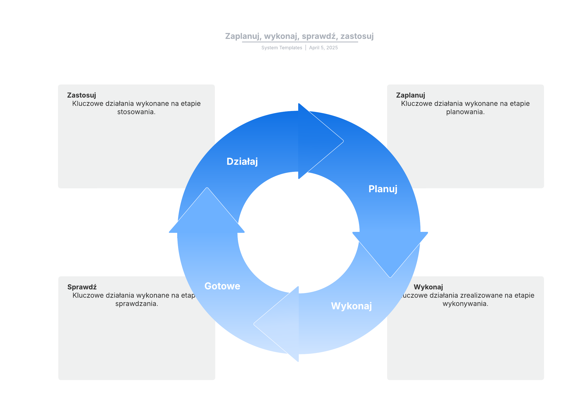 Otwórz szablon i dodaj treść, aby dostosować model PDCA do bieżącego projektu.