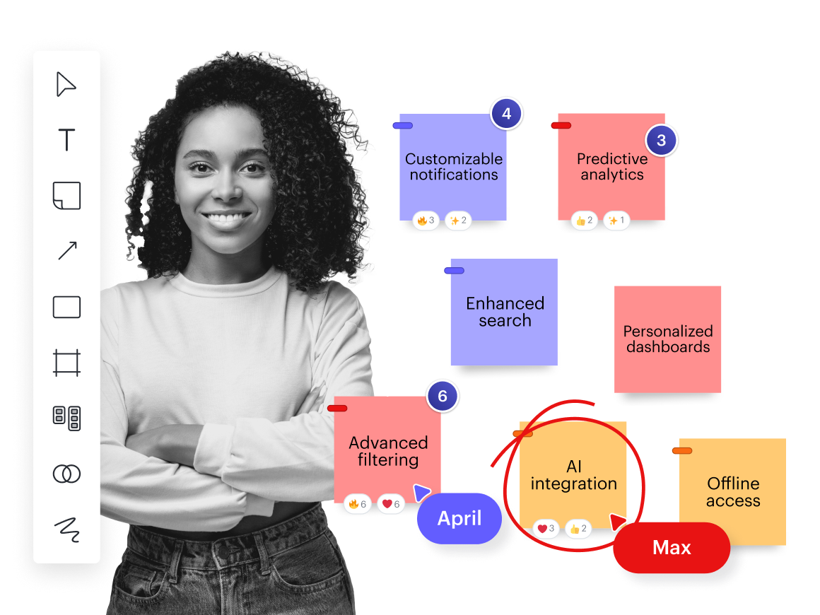 Add sticky notes to share and organize ideas. Give feedback using emoji reactions and comments.