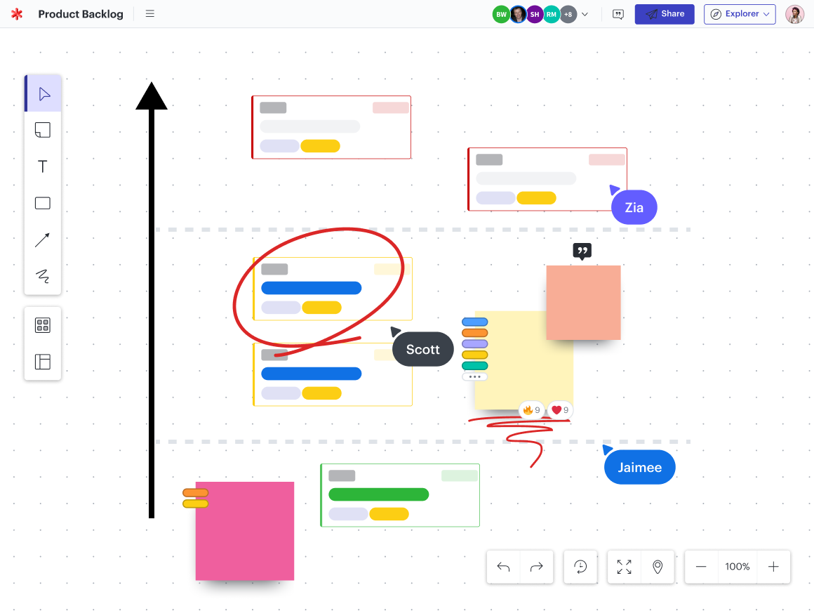 Imagine este cenário: você está identificando requisitos de um produto para o lançamento de um software. Você precisa envolver as partes interessadas de toda a empresa e decide que o e-mail ou o Slack podem não ser o melhor meio para isso, então agenda uma reunião. Durante a reunião, tenta registrar o feedback de todos no único formato que vem à mente: uma planilha. Você passa a reunião analisando cada ideia uma a uma e, quando se dá conta, a horário da reunião já acabou. Você sai da reunião sem prioridades ou itens de ação claros, e precisa convocar outra reunião para concluir o roadmap (roteiro).