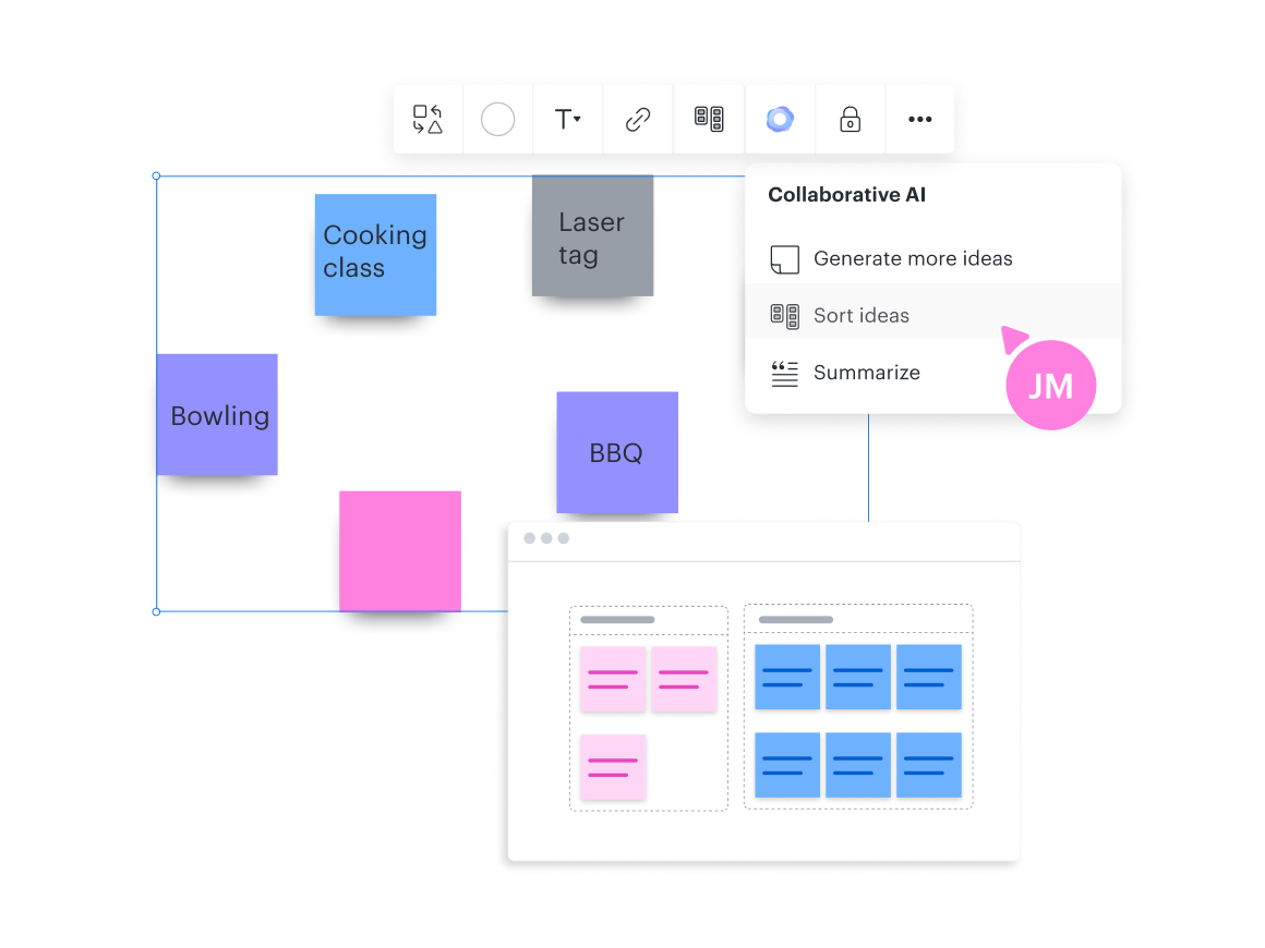 Use um prompt de IA no Lucidspark para gerar, organizar e resumir ideias. Como o nome sugere, a IA colaborativa foi projetada para ajudar toda a sua equipe a se inspirar, explorar ideias divergentes e descobrir com mais rapidez soluções mais inovadoras.