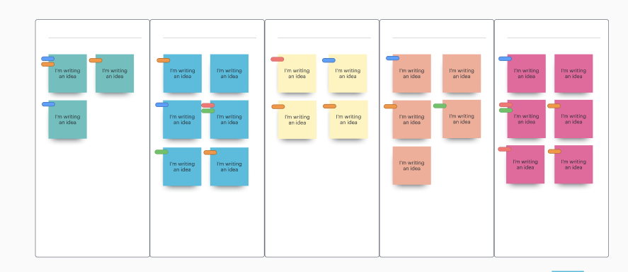 No entanto, quando o tempo acaba, dezenas de ideias ficam flutuando ao redor do mural, tornando difícil encontrar padrões e navegar com eficiência pelas próximas etapas do processo de brainstorming. Organizar ideias do brainstorming em insights significativos pode ser uma tarefa difícil.