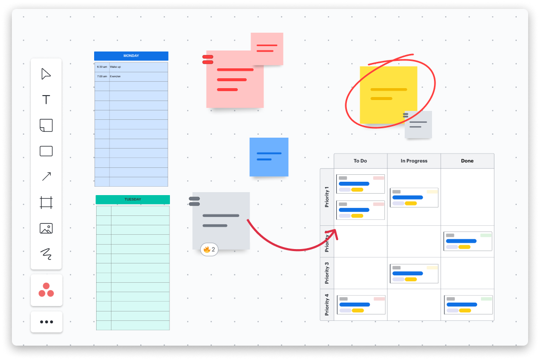 Com a tela infinita do Lucidspark, você tem tudo o que precisa para criar um planner online e organizar todos os aspectos da sua vida. Atribua tarefas com acompanhamentos, preencha matrizes de priorização e personalize seu planner muito além de simplesmente listar tarefas e compromissos, tudo em um único mural prático.